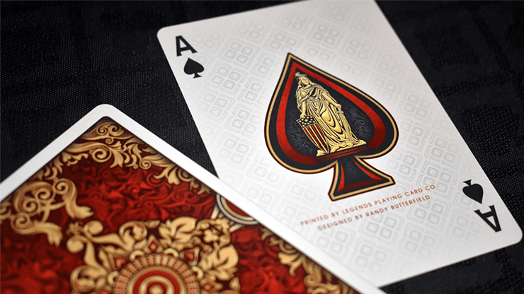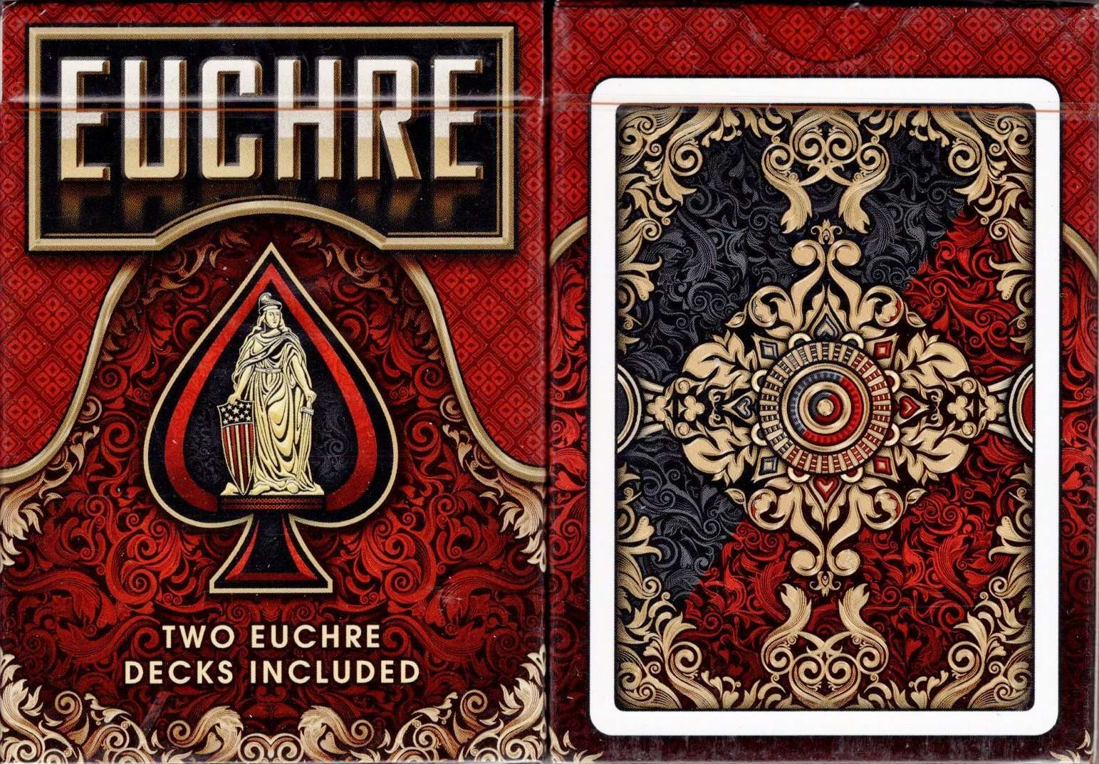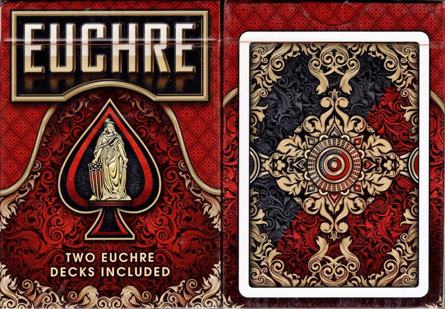 Popular in many parts of the world, especially the American midwest. Euchre is a trick-taking card game most commonly played with four people - two teams of two. The EUCHRE V2 Deck includes two full Euchre decks inside one tuck box (red and black). It's printed by Legends Playing Card Co., with their Taiwan printer, and utilizes their exceptional Classic Finish.The back cards feature an elaborate and ornate baroque design. Each red and black set of Face cards includes the full suits of nines, tens, Jacks, Queens, Kings and Aces (2-8 and Jokers are not needed in most Euchre games). The semi-custom Courts incorporate the same elements from the back cards, in a gold-colored backdrop setting. They are extremely functional and provide the highest level of playability.