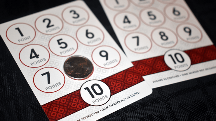 Also included are two rules cards and four custom score cards. You just need a dime as your points marker. No need for boring fives as makeshift score cards in the EUCHRE V2 Deck!