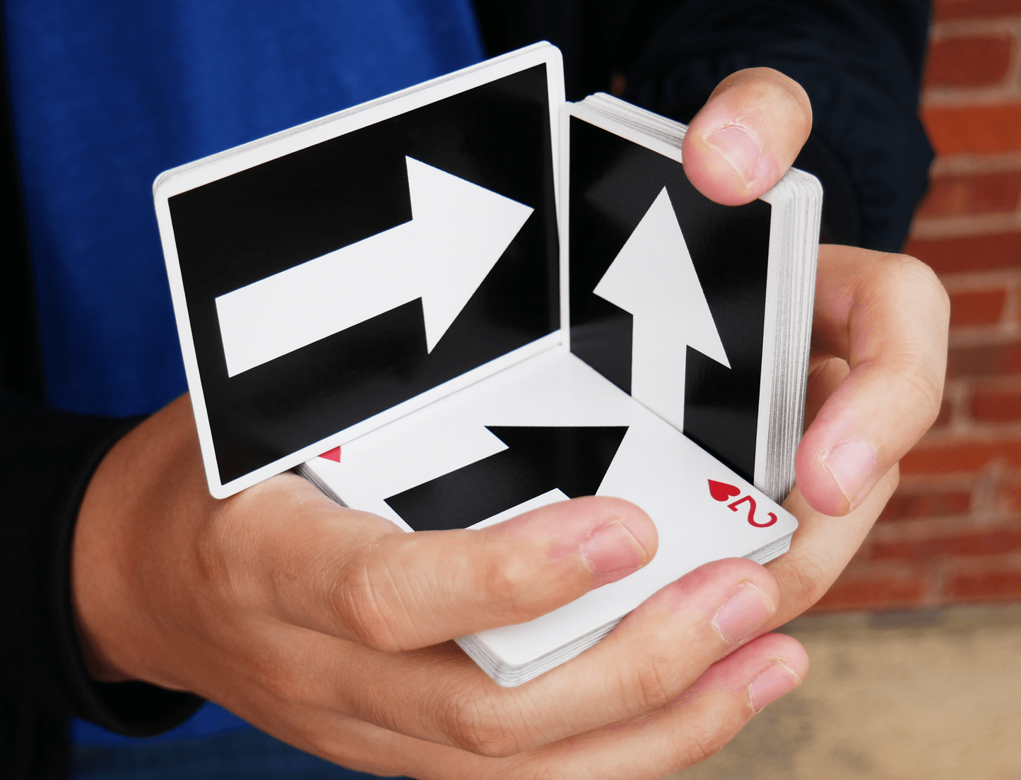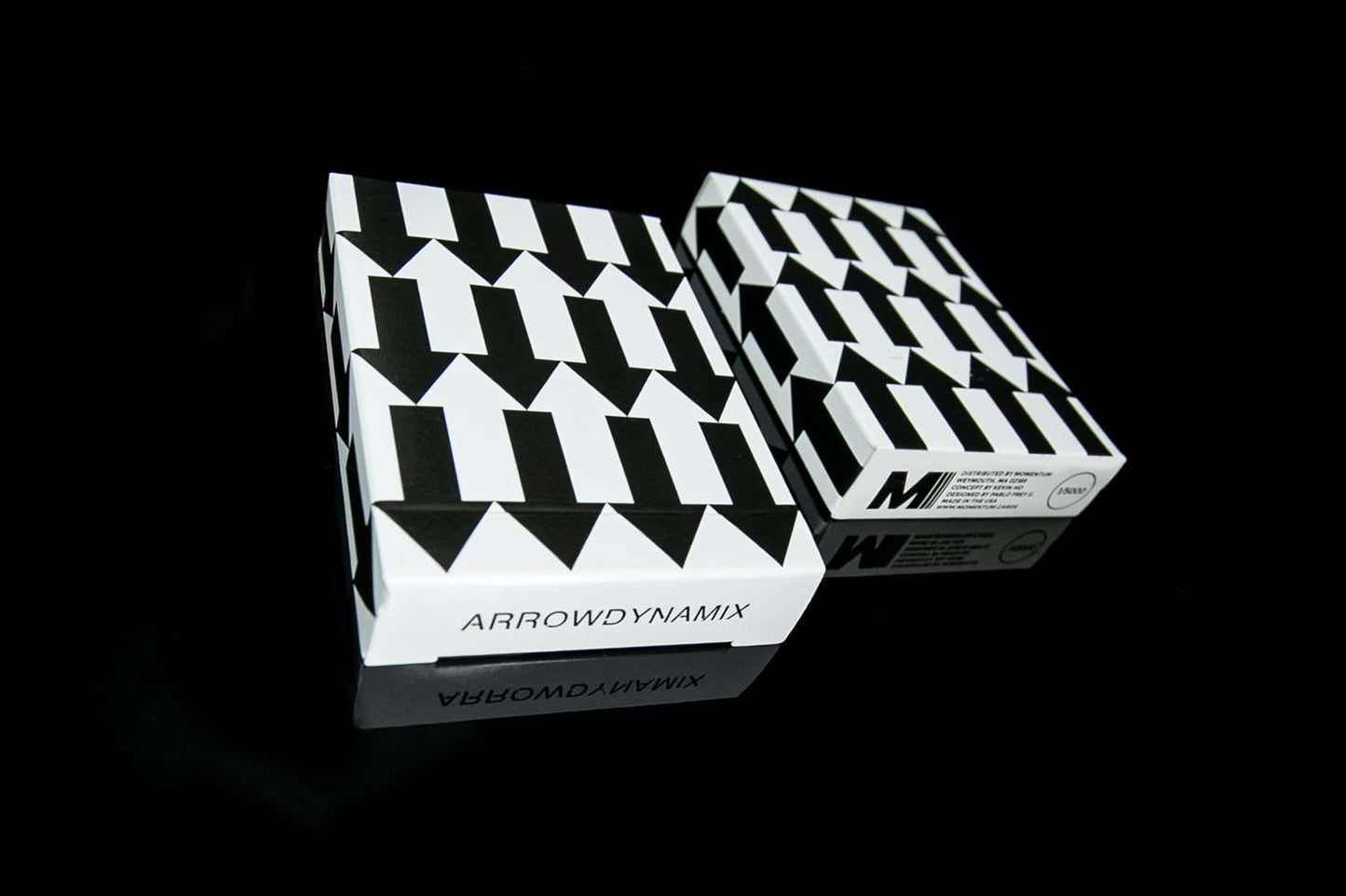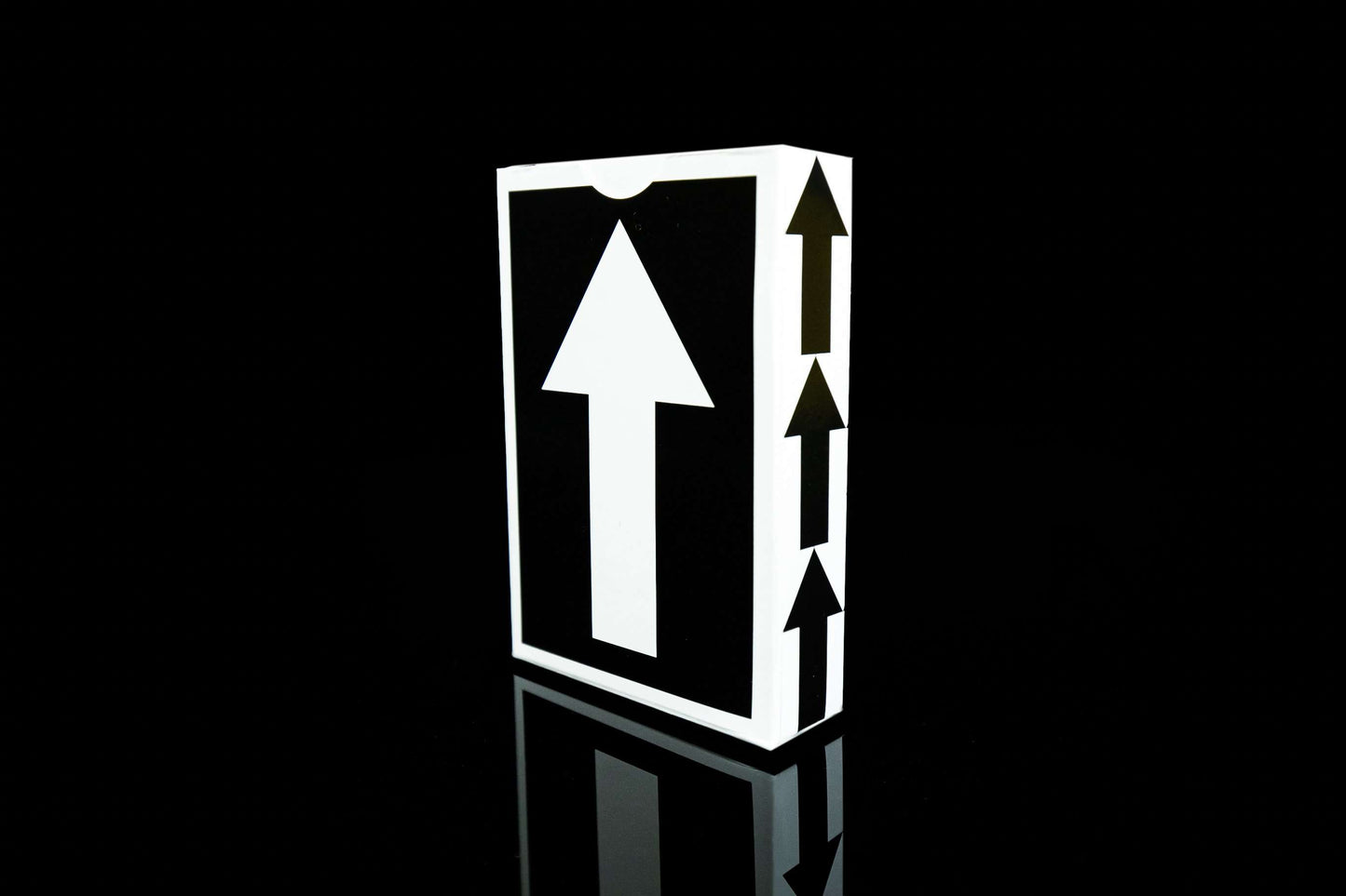 ArrowDynamix is a groundbreaking, minimalist Cardistry deck designed to enhance your moves and imbue them with a sense of logic, flow, and direction. Each card has a vertical arrow on the back and a horizontal arrow on the face, allowing for a myriad of combinations that you can either orchestrate or create chaotic patterns with. It is also a useful aid in creating new moves, which you can do so by simply initiating movements according to the randomized directions that you find the arrows pointing in.