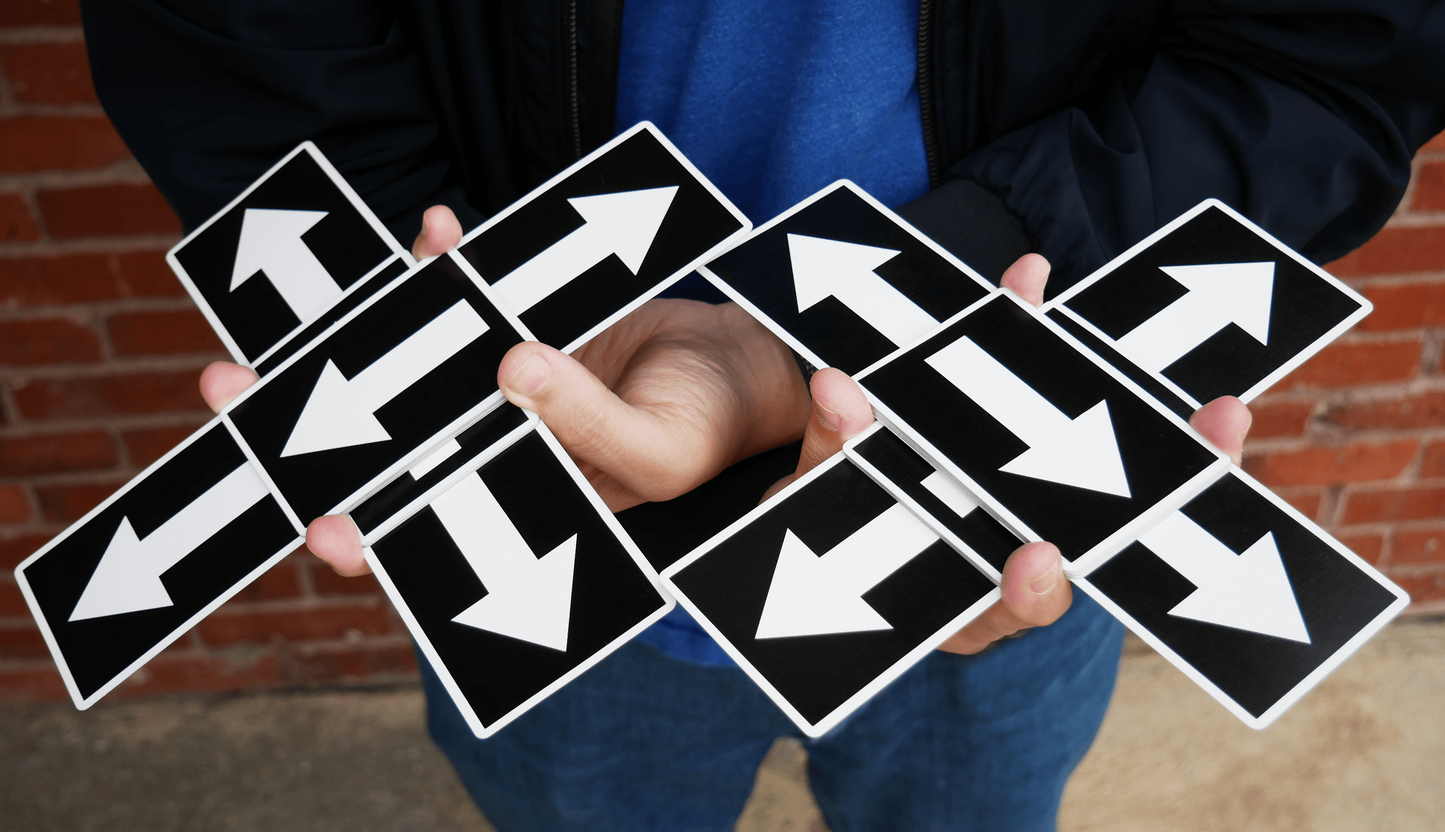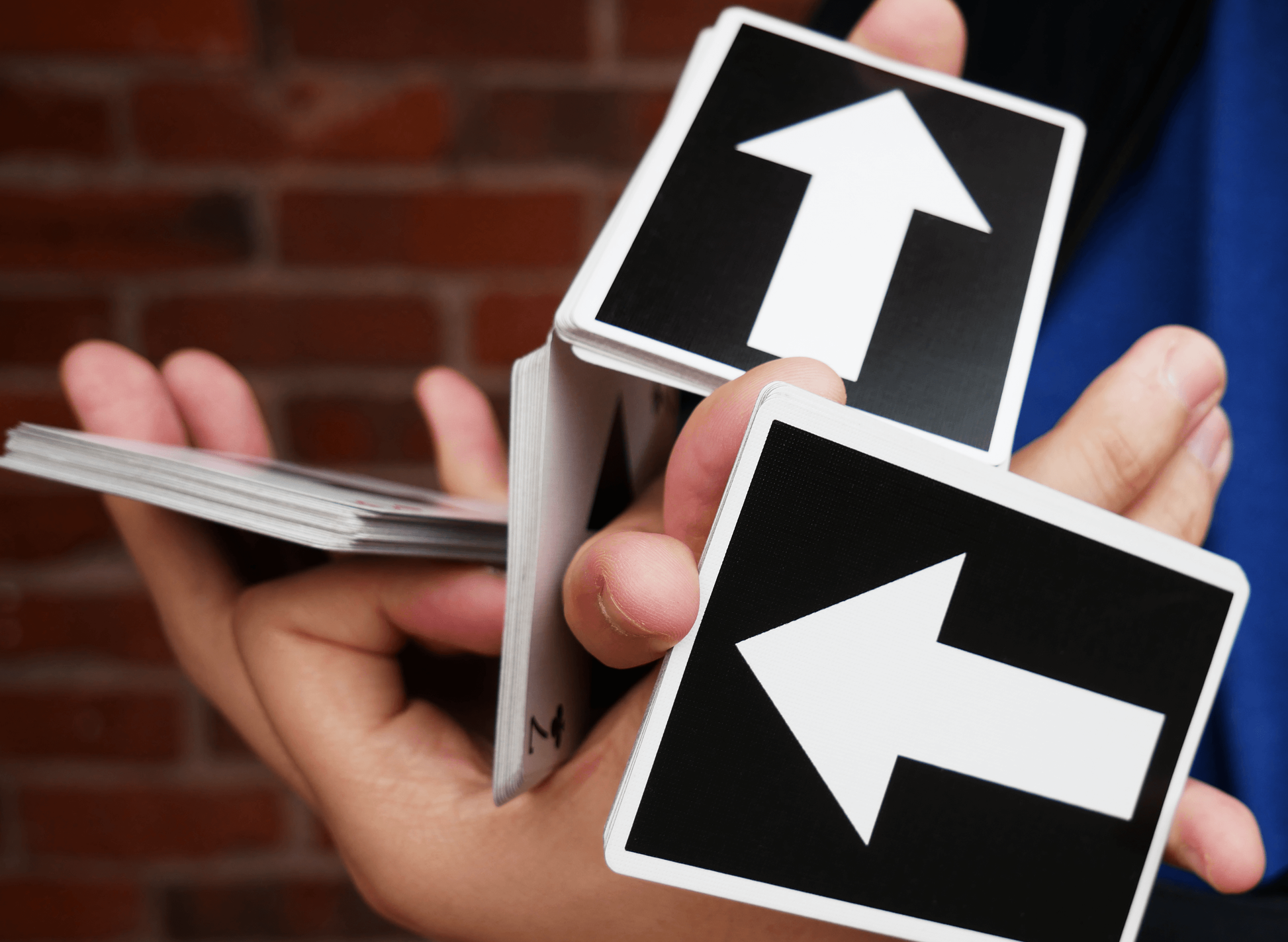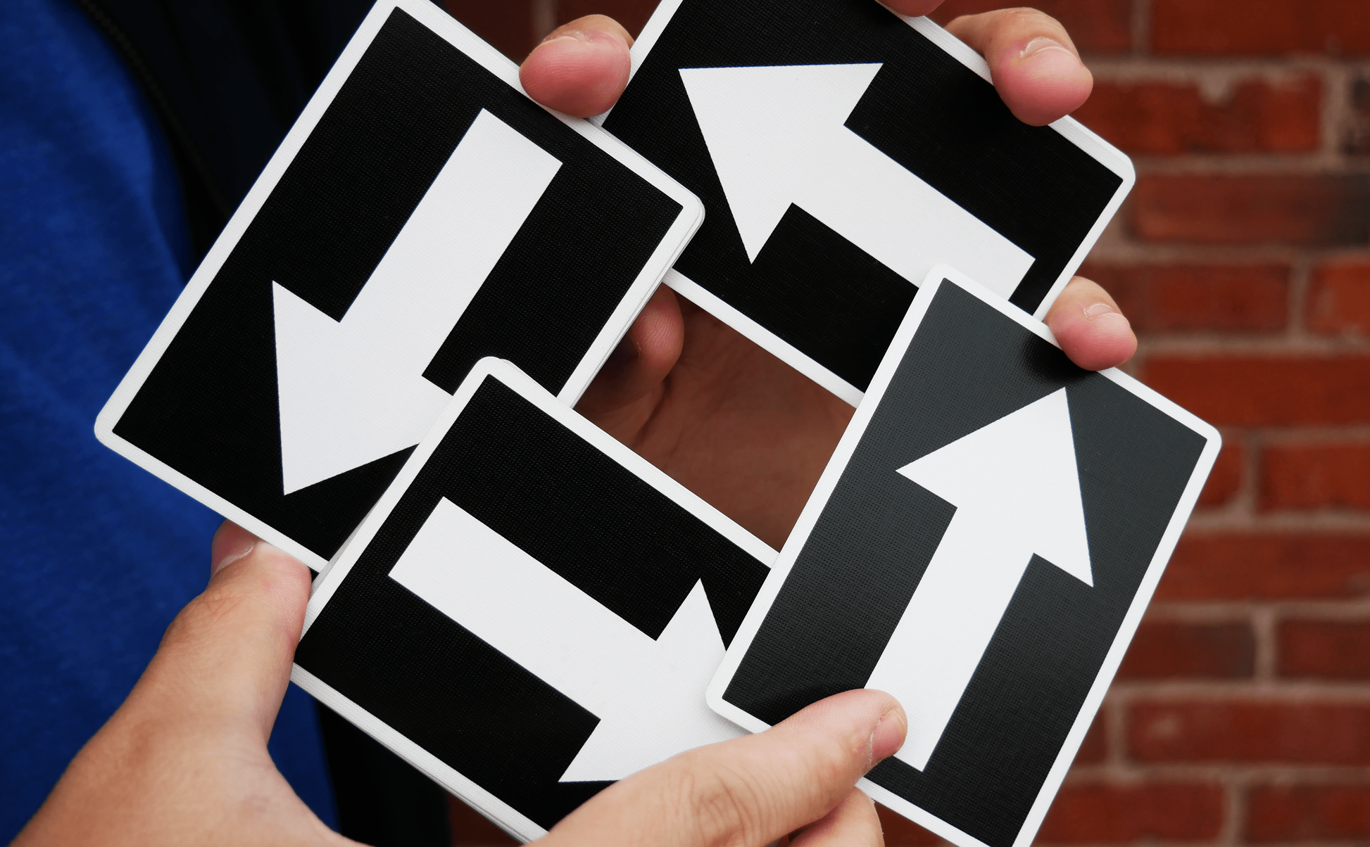 ArrowDynamix is a groundbreaking, minimalist Cardistry deck designed to enhance your moves and imbue them with a sense of logic, flow, and direction. Each card has a vertical arrow on the back and a horizontal arrow on the face, allowing for a myriad of combinations that you can either orchestrate or create chaotic patterns with. It is also a useful aid in creating new moves, which you can do so by simply initiating movements according to the randomized directions that you find the arrows pointing in.