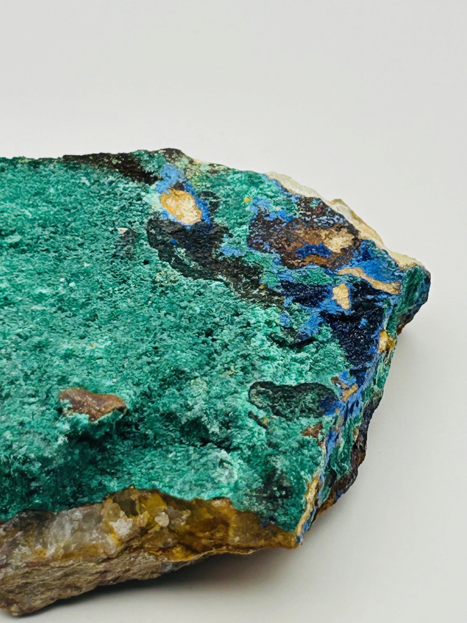 This vibrant Azurite with Malachite specimen from Alnif, Morocco, showcases a natural fusion of deep celestial blue and lush green, symbolizing the union of insight and transformation. Azurite is known for enhancing intuition and mental clarity, while Malachite offers powerful protection and emotional healing, making this copper-born duo a potent ally for spiritual growth, shadow work, and energetic cleansing. Its raw beauty and layered mineral textures evoke ancient alchemy, inviting reflection, release, and renewal in any sacred space or collector’s cabinet.