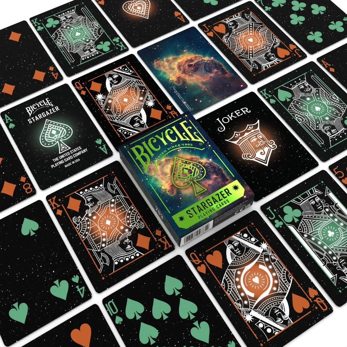 Journey to the stars with Bicycle Stargazer 203 Playing Cards, featuring stunning imagery of the Jet in Carina Nebula, captured by the Hubble Telescope. Each card back showcases this celestial wonder, while constellation-themed court cards and a green foil-accented tuck add a cosmic touch. Perfect for stargazers, collectors, and lovers of the universe.