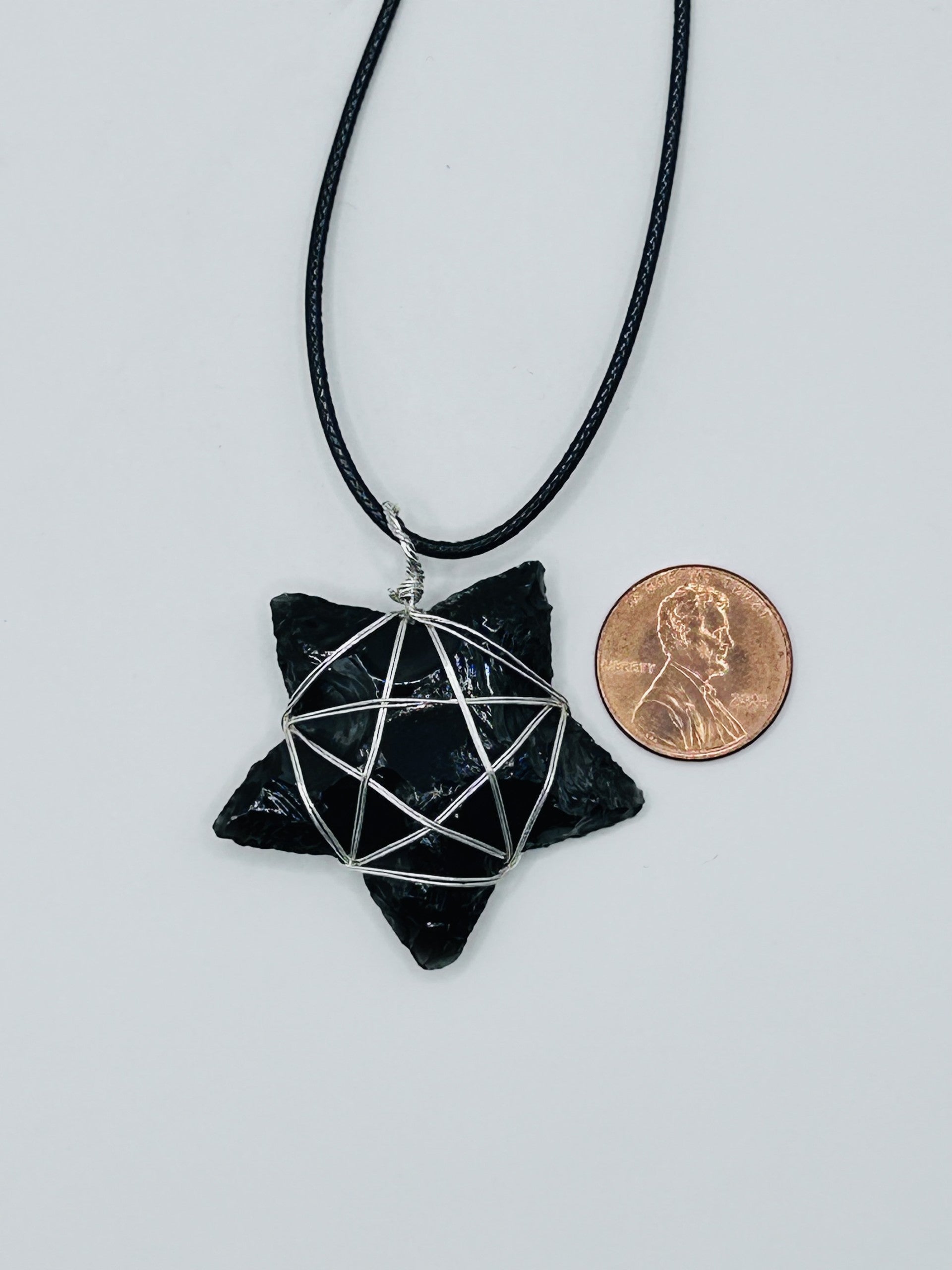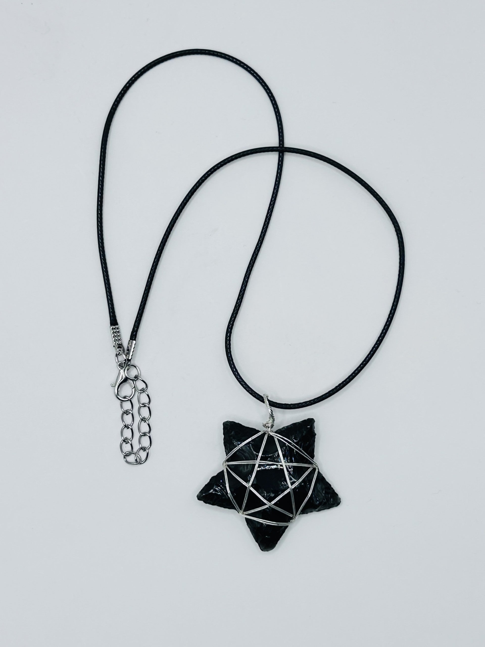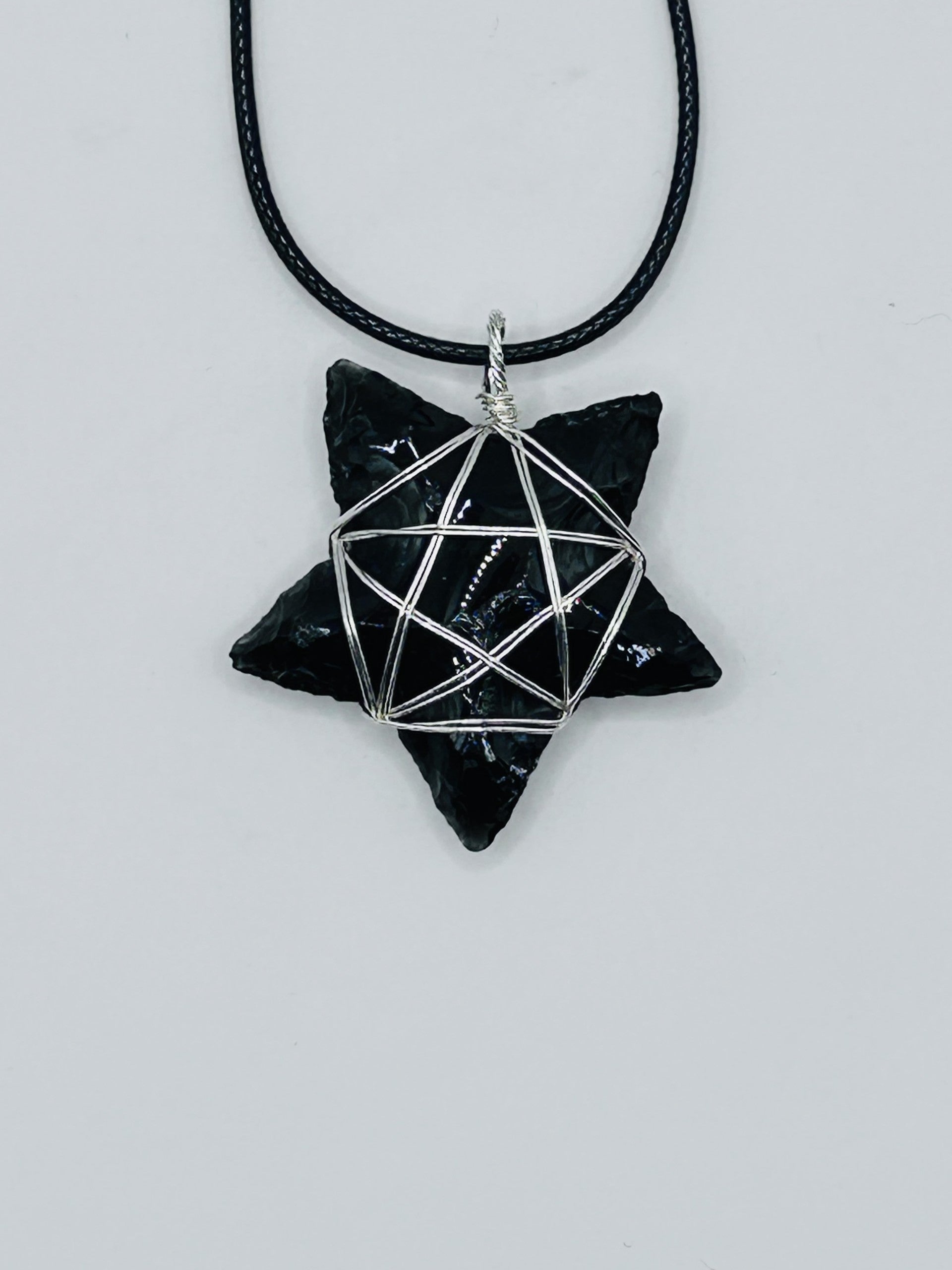 A talisman of clarity and protection. This six-pointed star, carved from black obsidian and cradled in silver wire, channels grounding energy and shields against negativity. Worn close to the heart, it invites inner strength and spiritual alignment. Finished with an adjustable black leather cord for effortless wear this piece is as empowering as it is elegant.