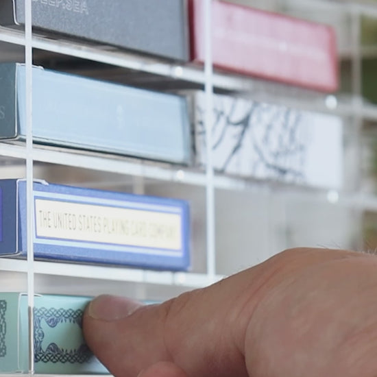 The Carat XDR24L Deck Rack is made of a combination of clear 3mm and 5mm archival quality acrylic and holds 24 decks in 3 columns of 8 with the side of the tuck facing outwards for easier recognition of your decks. The XDR24L comes with a 5mm acrylic lid that is attached with 8 pairs of neodymium magnets to ensure that it is attached securely while allowing for it to be removed relatively easily.