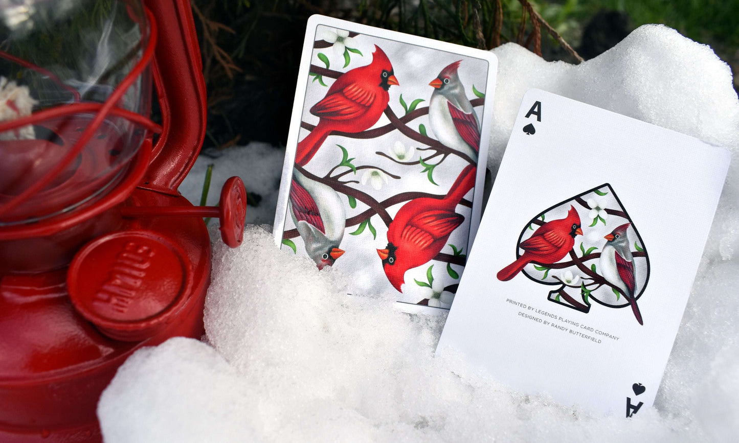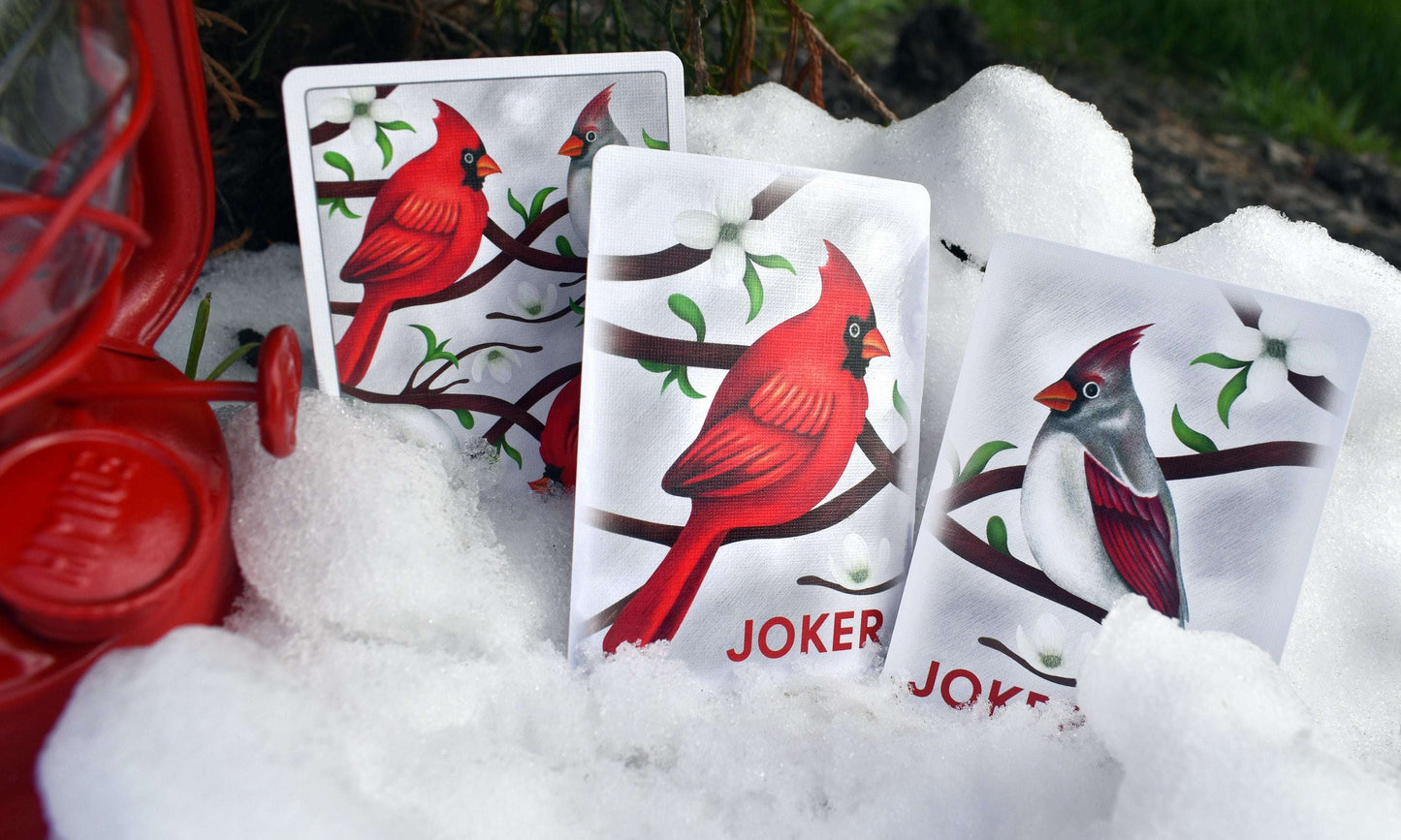 The Cardinals POKER Deck features hand drawn Cardinals imagery throughout the design. It’s printed by Legends Playing Card Co., with their Taiwan printer, and utilizes their exceptional Classic Finish.The Back Card features a symmetrical illustration of a pair of male and female Cardinals set against the light grey winter-like background. The Face Cards for the Cardinals POKER Deck are extremely playable, and the hand drawn backgrounds are subtly added to the PIPs and to the outfits of the standard Courts. The Ace of Spade is highlighted by the pair of Cardinals. And the non-matching Jokers are a diptych scene with the female on one Joker, and the male on the other Joker.The Tuck Box features a light grey winter-like background and a beautiful composition of the Cardinals couple. It’s printed in 4-Color Process on a premium Matte Stock and has clear UV Spot Ink overlay in strategic areas of the design. The Cardinals POKER Deck is a perfect fit for any game night!