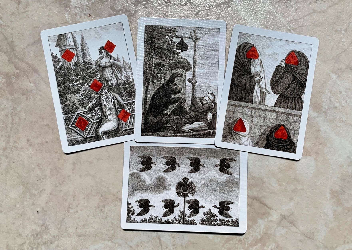 Introducing a precisely restored and digitally hand-recreated reproduction of the next Cotta's almanac deck full of history, and for the fifth time, strongly touched by Schiller's works, continuing after the previous red, yellow, green, and blue one, which was the first published complete transformation playing card deck in the world!