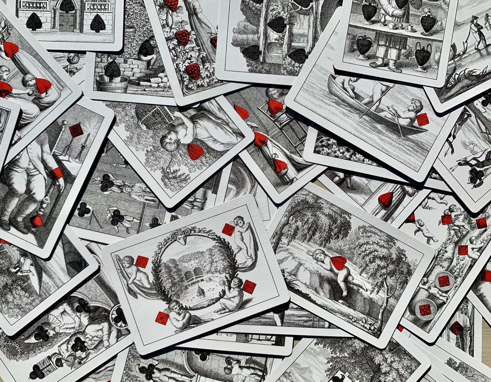Introducing a precisely restored and digitally hand-recreated reproduction of the final Cotta's almanac deck full of history, and for the sixth time, strongly touched by Schiller's works, continuing after the previous pink, red, yellow, green, and blue one, which was the first published complete transformation playing card deck in the world!