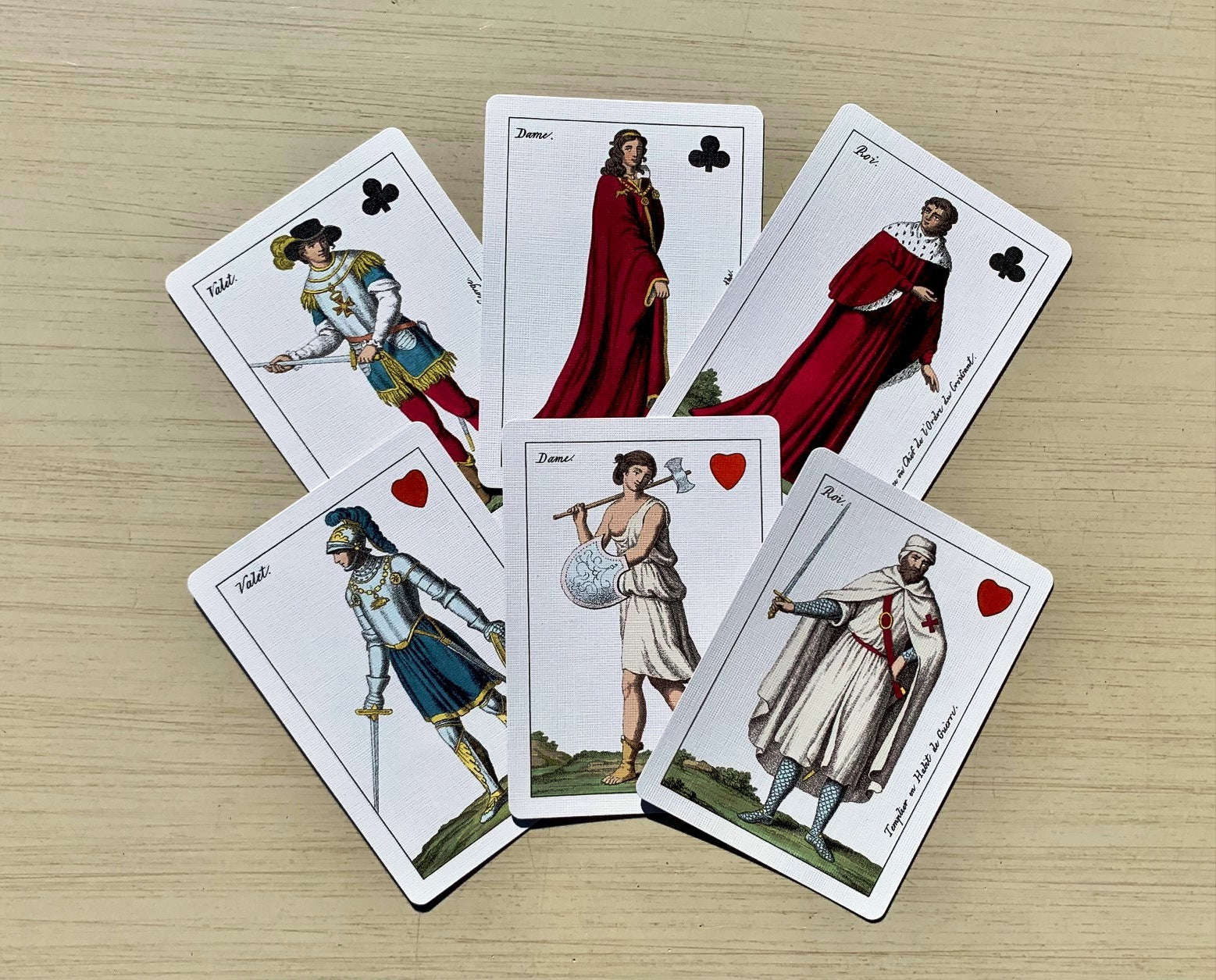 The court card figures depict members of various knightly orders, and the characters are in the robes of various orders of real knighthood / damehood or spiritual orders, while the theme of number cards is romantic or even spiritual with a variety of subjects & sixteen of pip cards have scenes that can be considered illustrative of the four seasons.