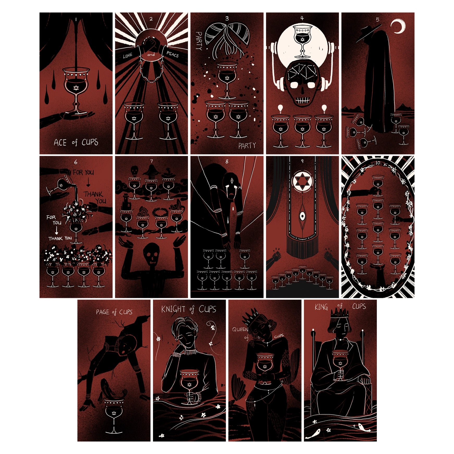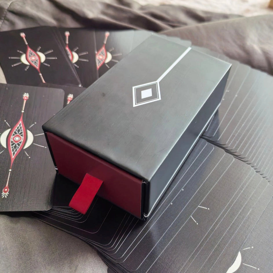 Born to disrupt, this deck opens a channel of communication between you and the red-stained unknown, where chaos births new meanings. The cards are painted with raw, spray-textured strokes that evoke woodcut prints, embracing imperfection to reveal deeper truths. Product Details