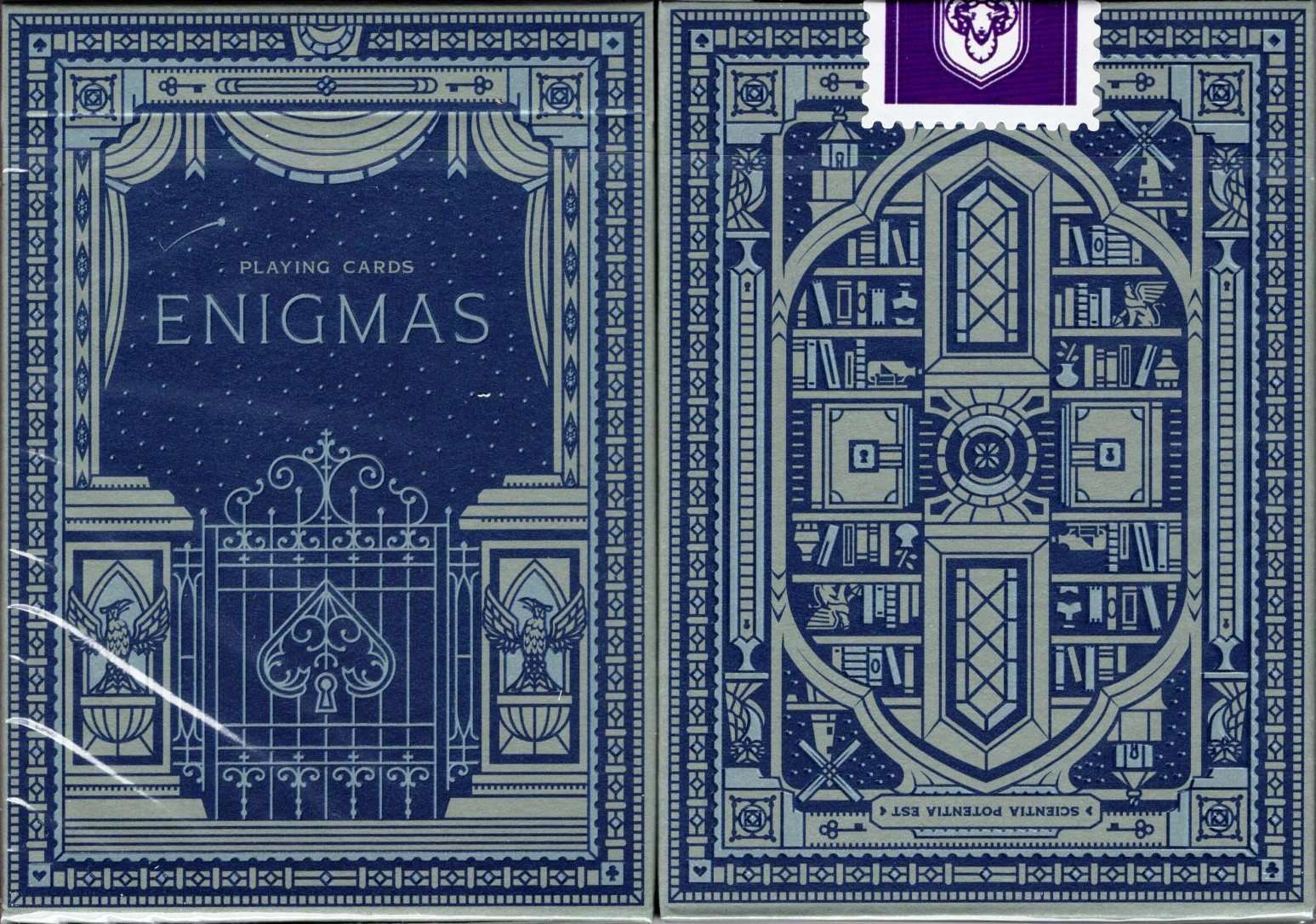 In addition to the four puzzle cards, there are also codes hidden in various design element throughout the back artwork. Enigmas were printed by The US Playing Card Company.