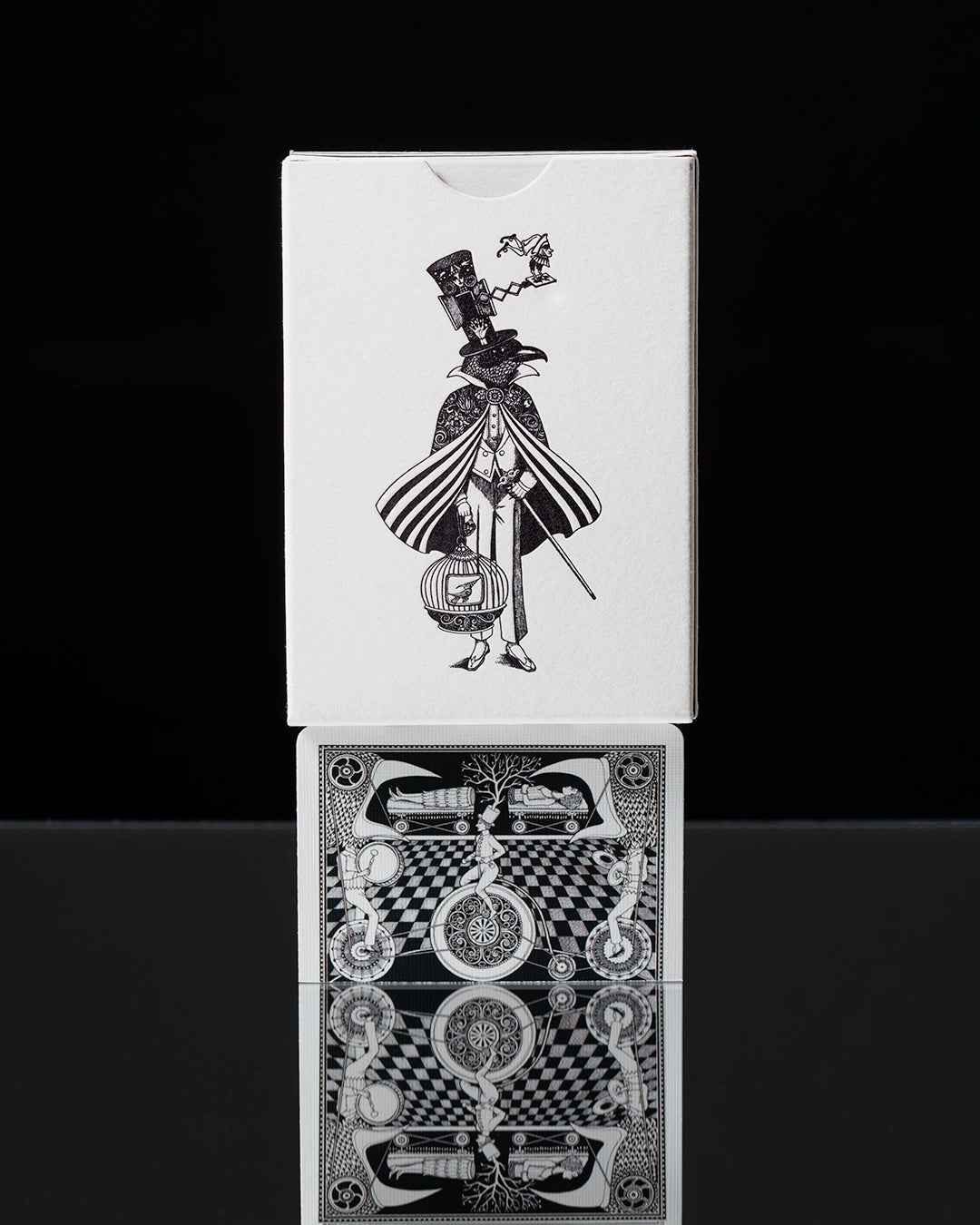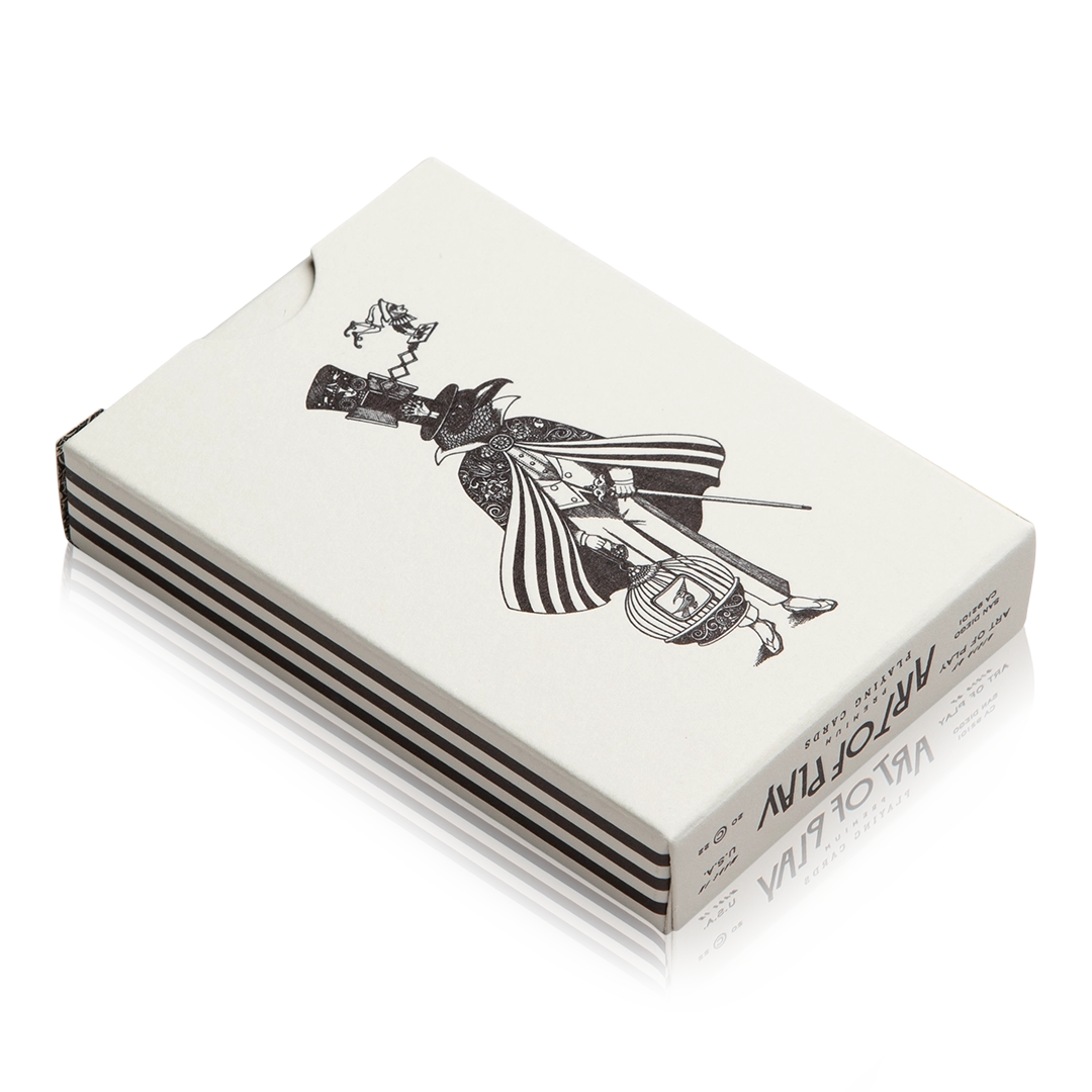 Inspired by the art of magic and the grand stage illusions performed by the great magicians of the eighteenth century. This unique deck features thirteen custom backs that create a flipbook-like animation when riffled between the hands depicting the classic "Sawing in Half" illusion while an Orange Tree blossoms between. A marvelous feat of both illusion and design, hand illustrated by Ukrainian artist, Sveta Dorosheva. Other features include a custom ace of spades, two jokes and an extra card that can be made into a Thaumatrope optical toy. Housed inside a letterpress-printed tuck box.