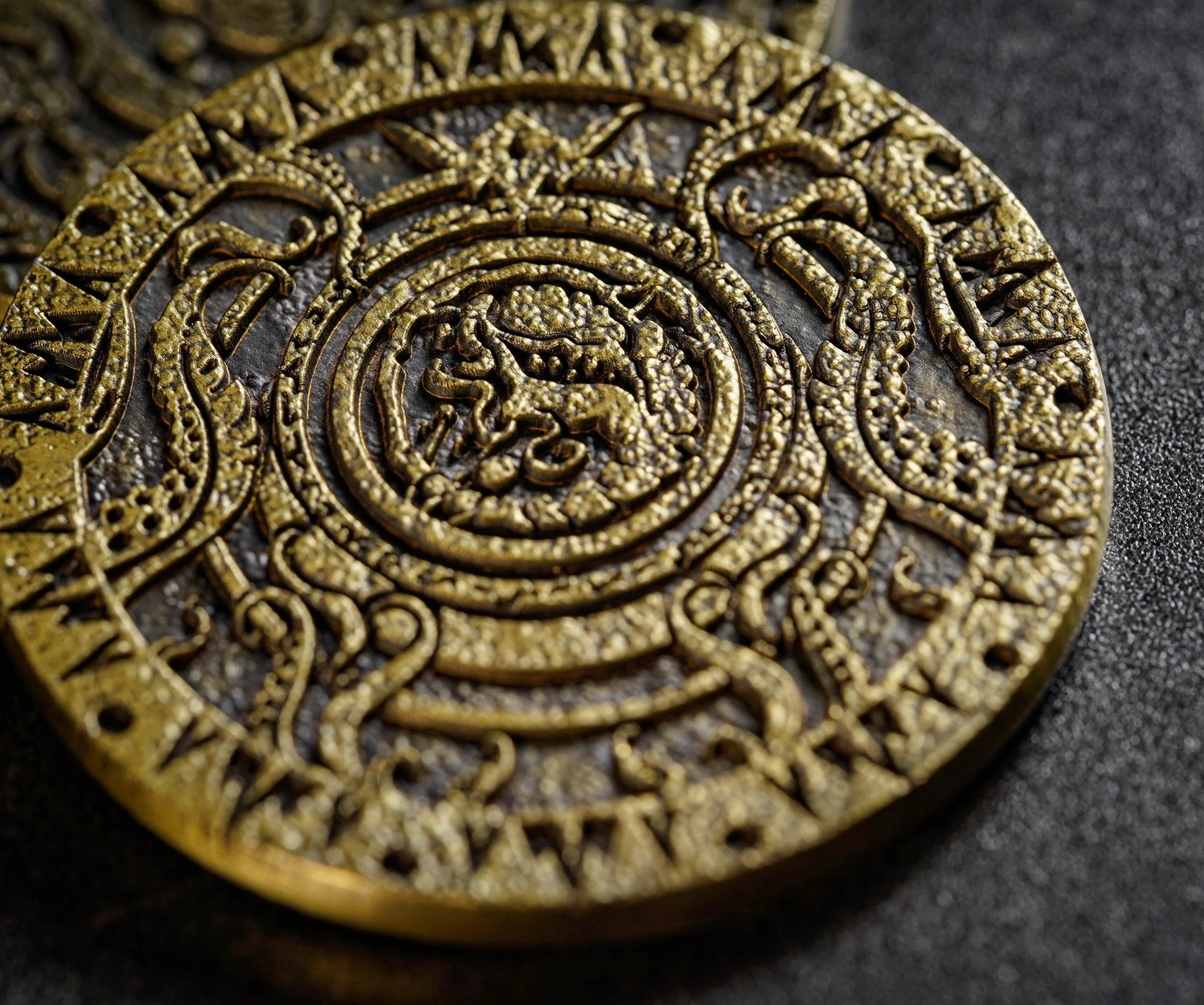Each of the four coins is represented by a natural element, a corresponding suit of Minor Arcana, and an emblematic Lovecraftian deity:
