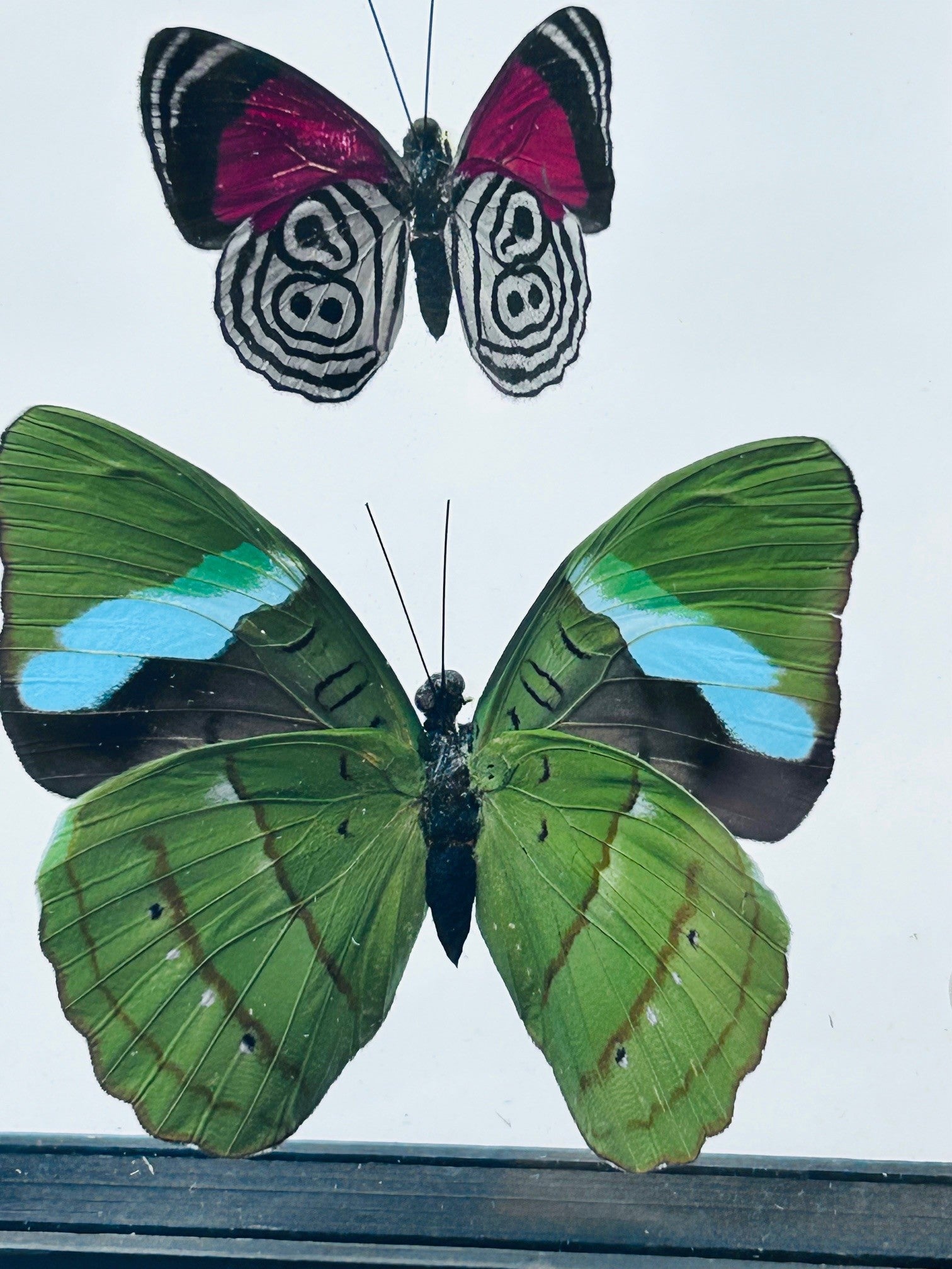 Striking green wings with iridescent blue bands. A rare beauty that embodies renewal, vitality, and heart-centered transformation. Its coloration is due to structural light refraction, not pigment—a reminder that true magic lies in how we reflect the world.