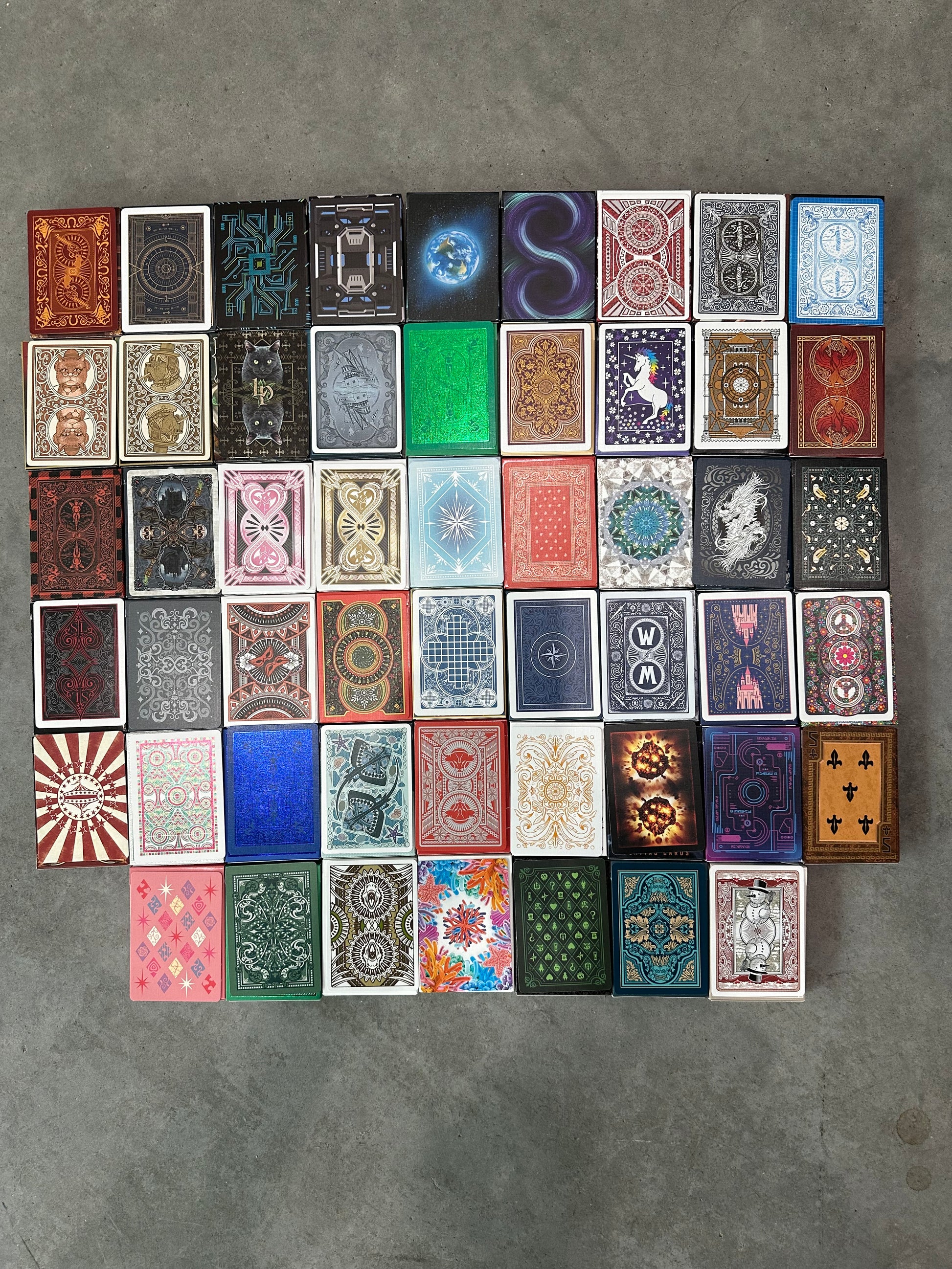 You will get 52 cards + 2 jokers from the decks in the picture. You will get a random tuck box and also PCD clear plastic box. The cards are brand new except for the assembly part, which was not easy!