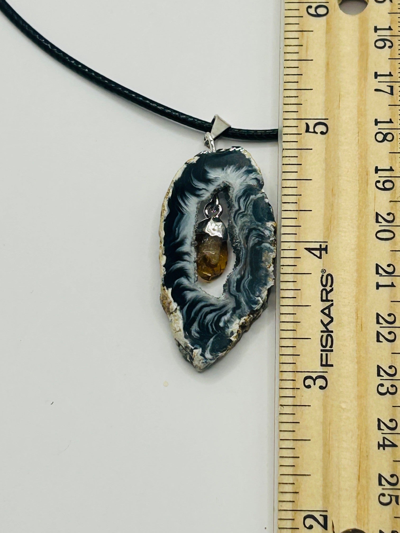 This elegant pendant features a polished black agate accented with citrine, creating a striking contrast between deep black tones and warm golden hues.