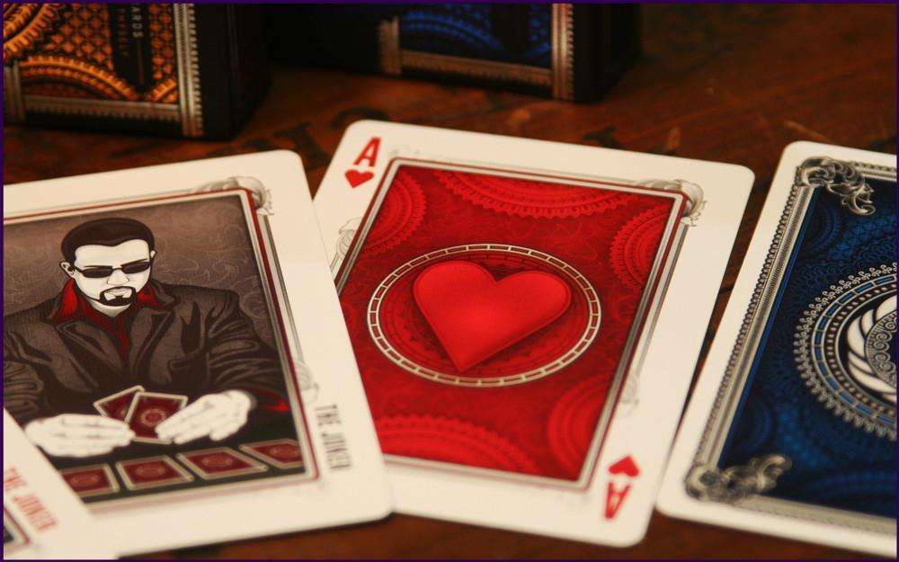 The Back Cards contain many intricate details and also subtle references to the games of Poker and Roulette. The Face Cards are designed with the intention for maximum playability. The Courts Set is from a more classical design than most modern Courts. They have been customized with elegant details and handpainted elements to make them unique on their own!