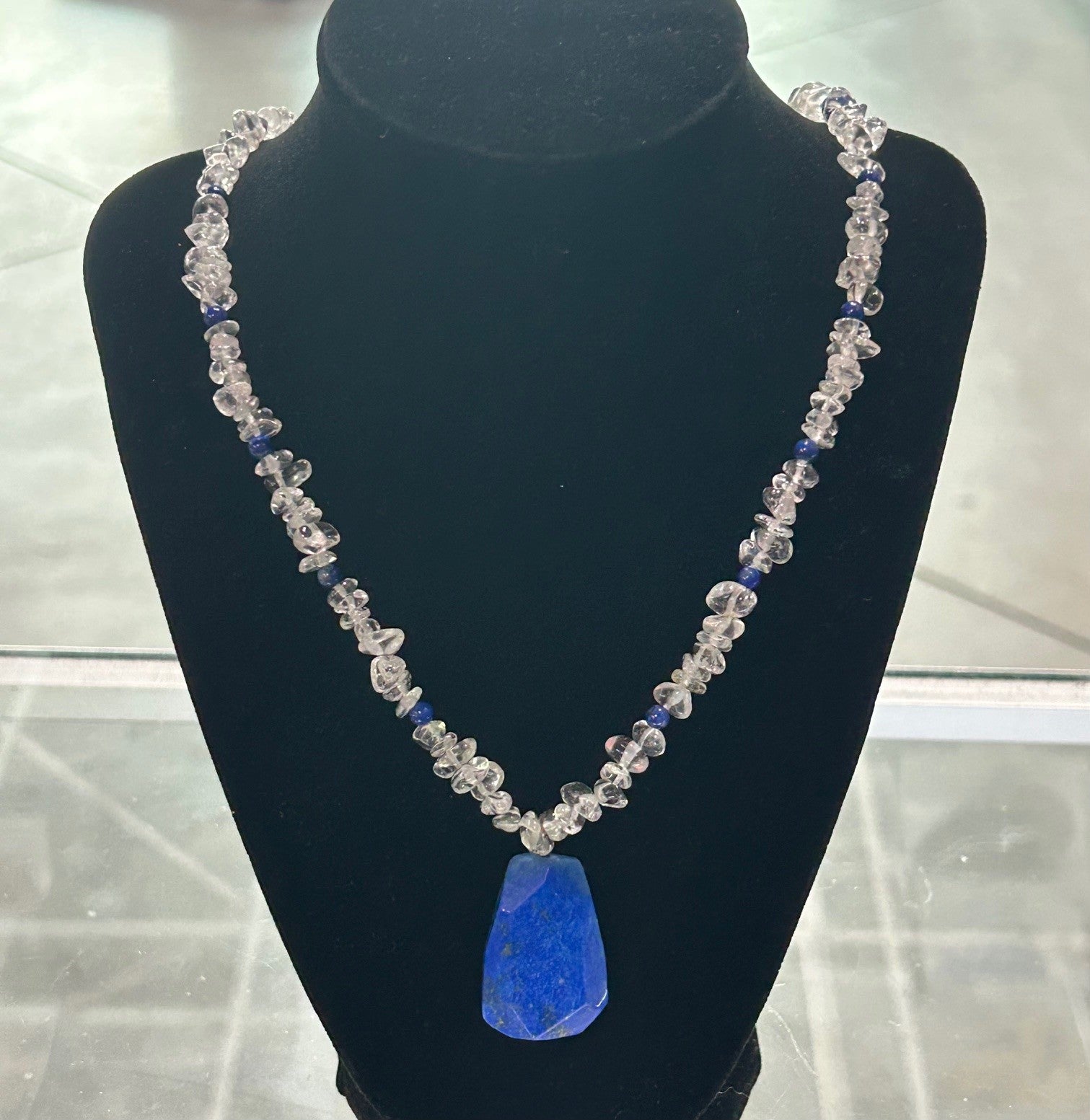 This handmade necklace features a stunning genuine lapis lazuli pendant paired with shimmering clear quartz beads, creating a beautiful balance of deep celestial blue and bright crystal clarity. The lapis centerpiece brings richness and bold color, while the quartz adds light, sparkle, and a clean, elegant contrast. Lapis is often associated with wisdom and truth, and quartz is known for clarity and amplification, giving this piece both visual beauty and meaningful energy. Crafted by hand with care, this necklace offers a timeless, versatile style that stands out effortlessly.
