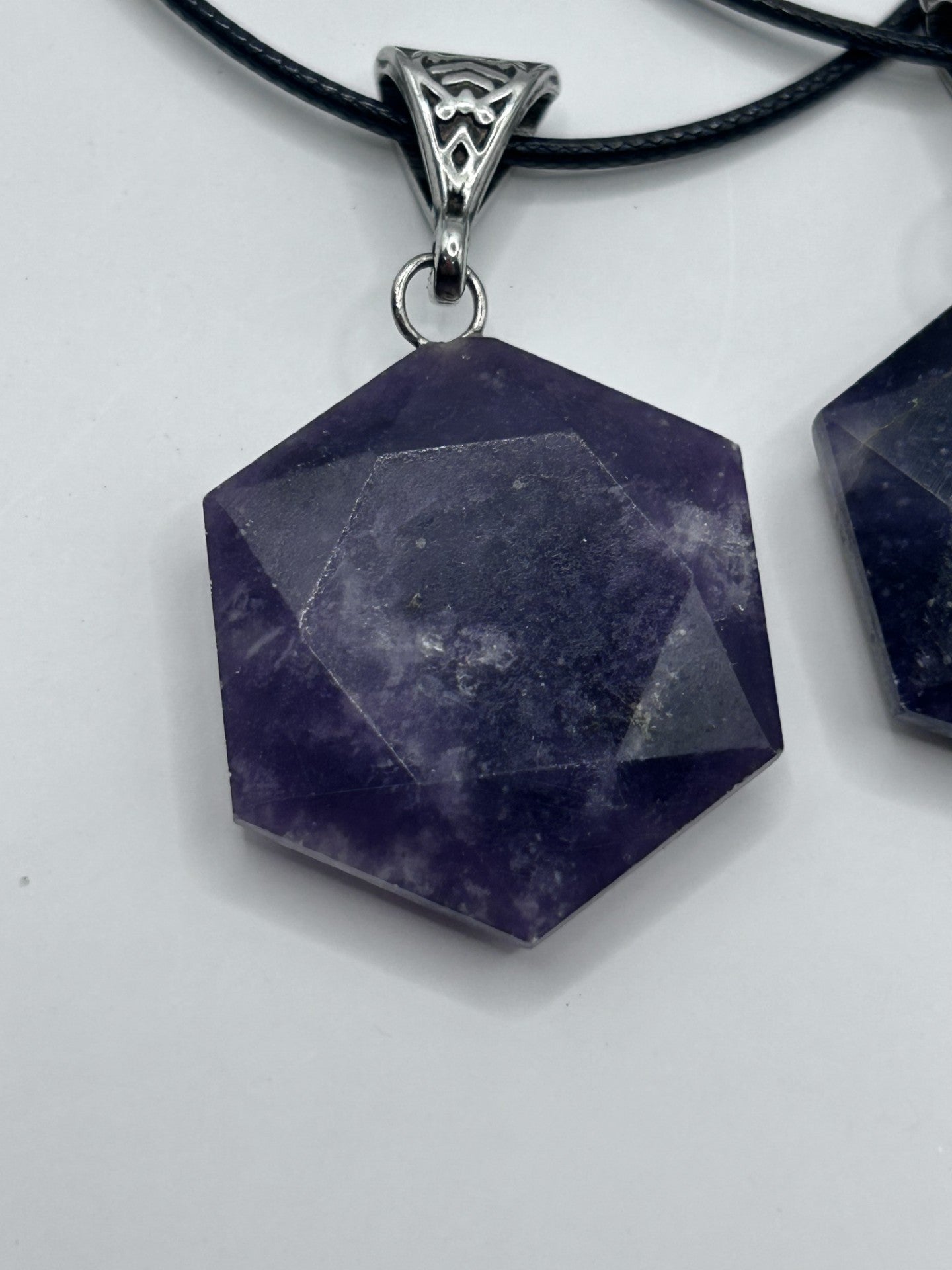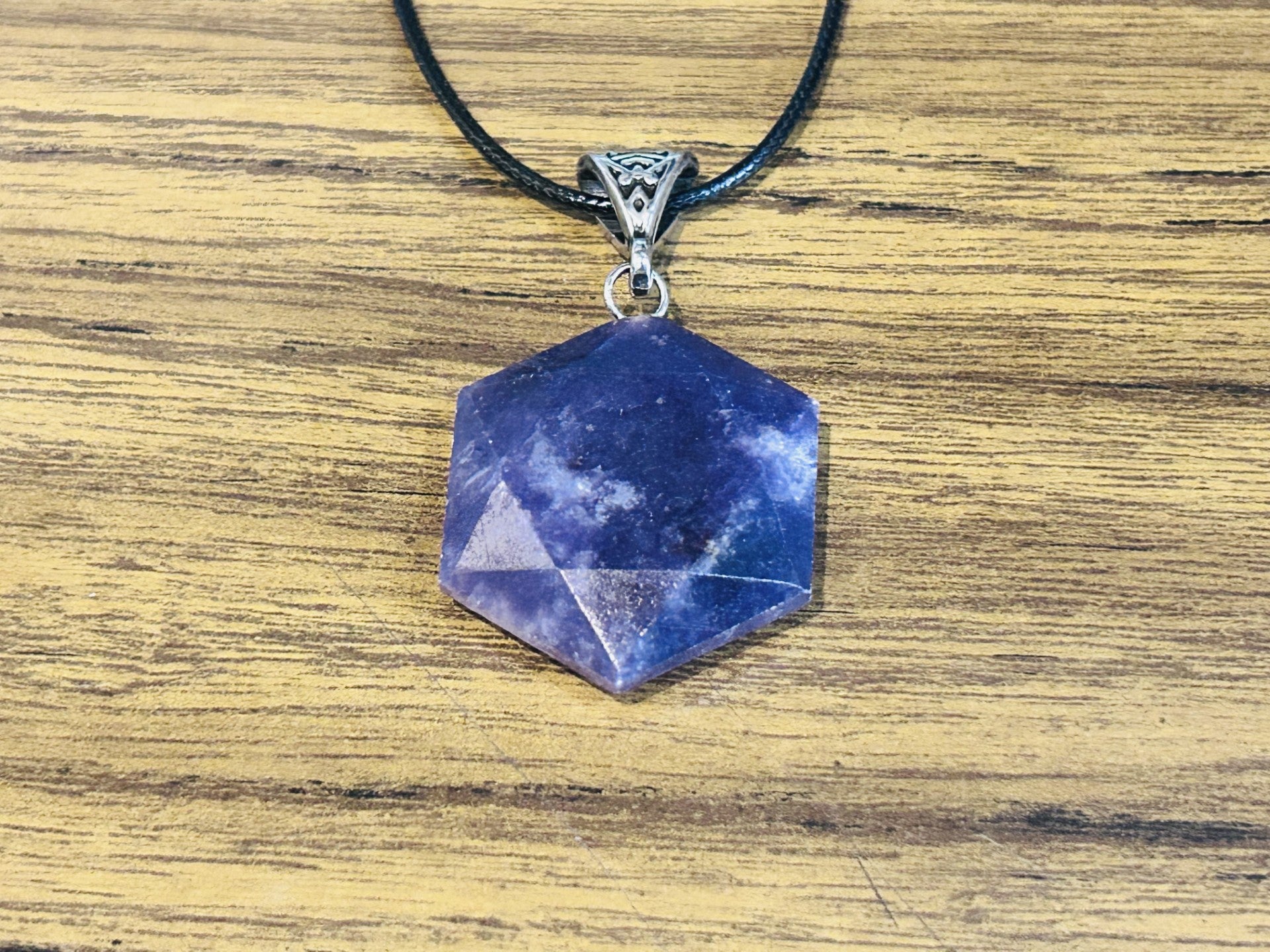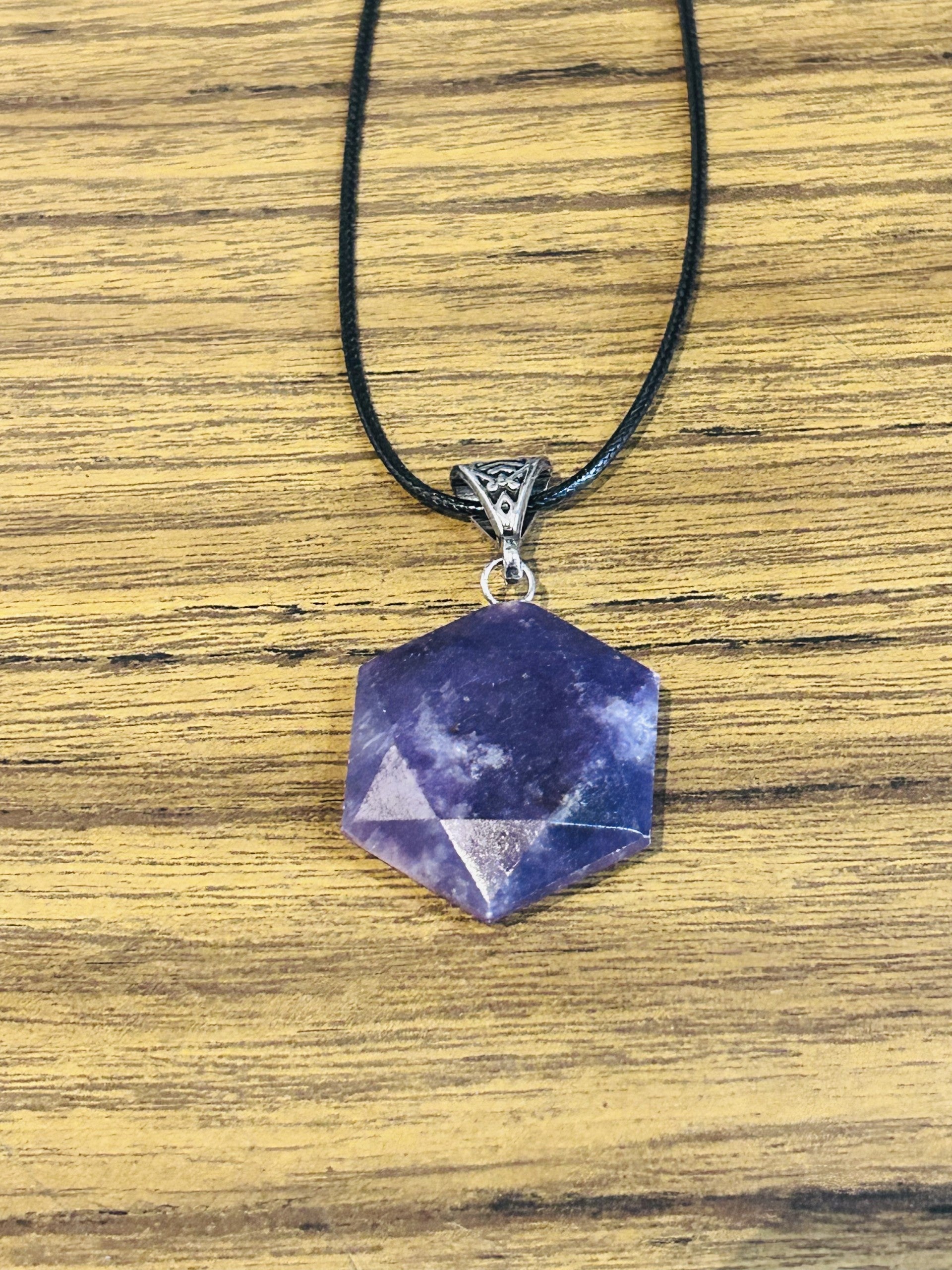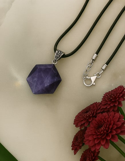 This striking hexagon-cut Lepidolite pendant is a wearable anchor for calm and clarity. Known for its soothing energy and lithium-rich composition, Lepidolite helps ease overwhelm and restore emotional equilibrium. Its rich violet tones shimmer subtly, catching light and intention in equal measure.