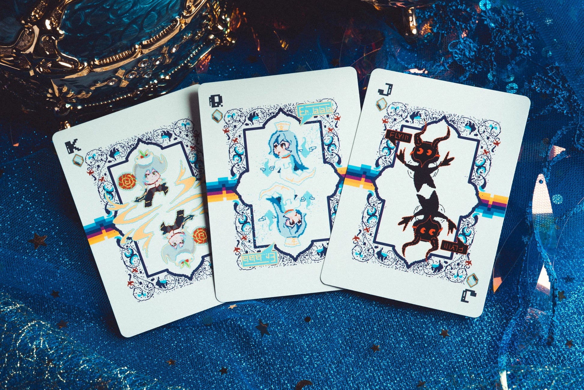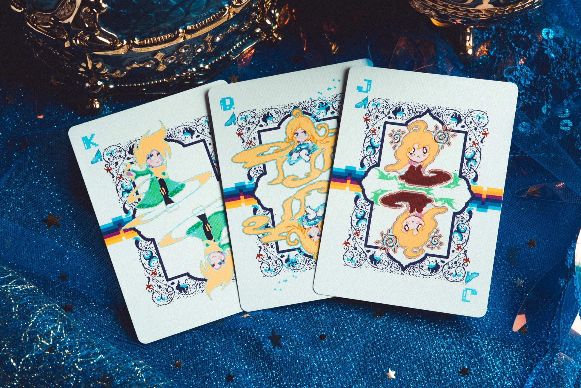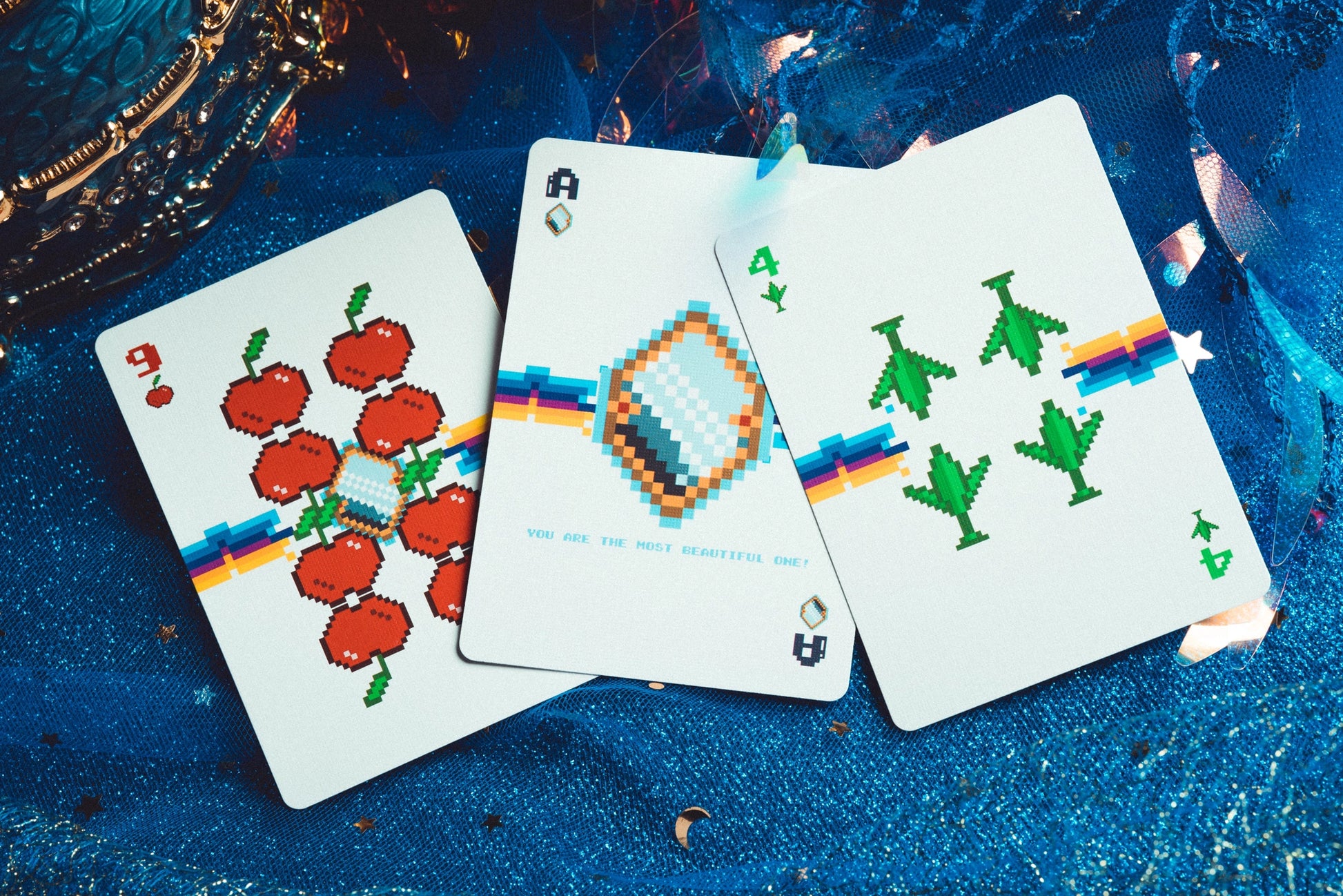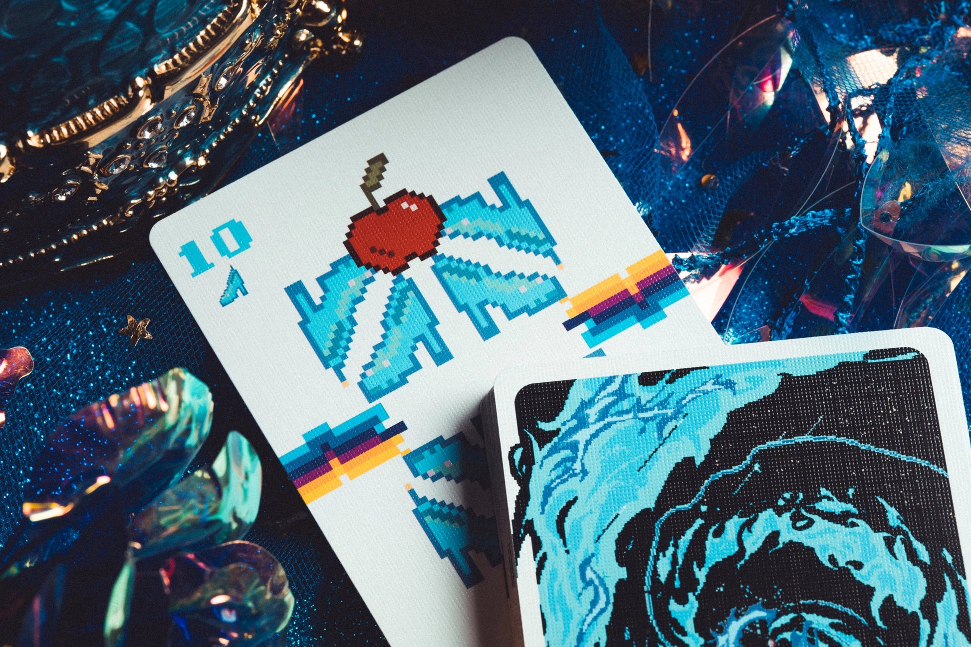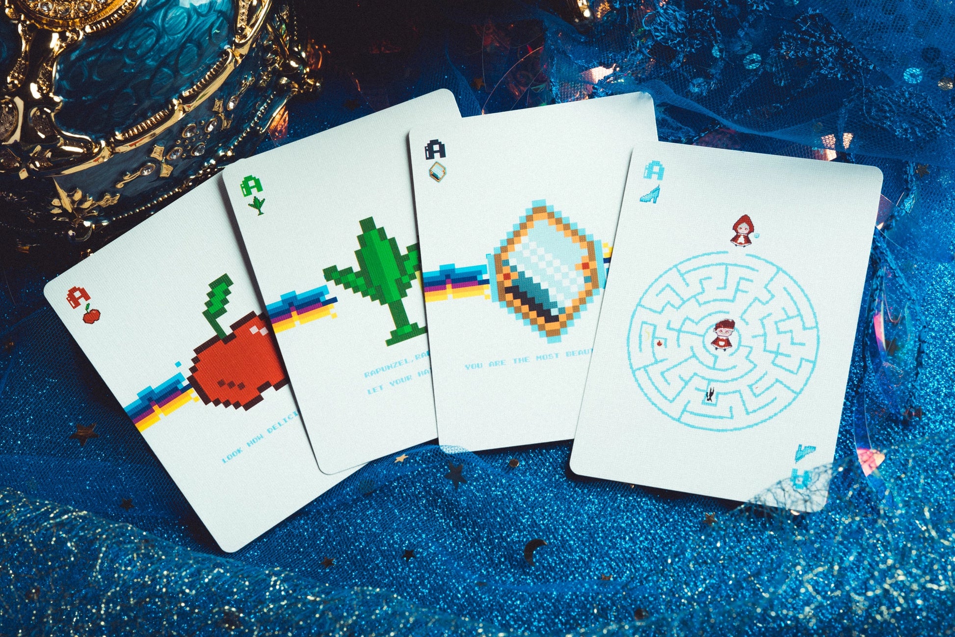 A pixel-art twist on the classic fairy tale, filled with retro nostalgia and playful surprises. From wolves in the woods to magical mazes and bit-sized apples, this deck brings charming chaos to the card table. Hood up. Basket ready. Enjoy your journey through a digital forest of fantasy!