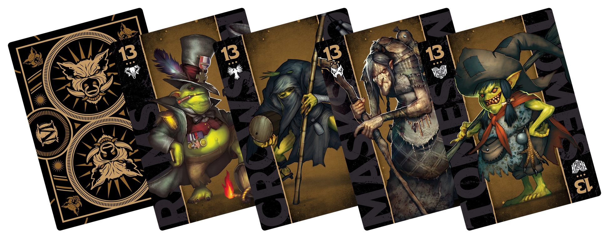 Instead of the standard suits, this deck uses the four suits of Malifaux: Rams, Crows, Tomes, and Masks.