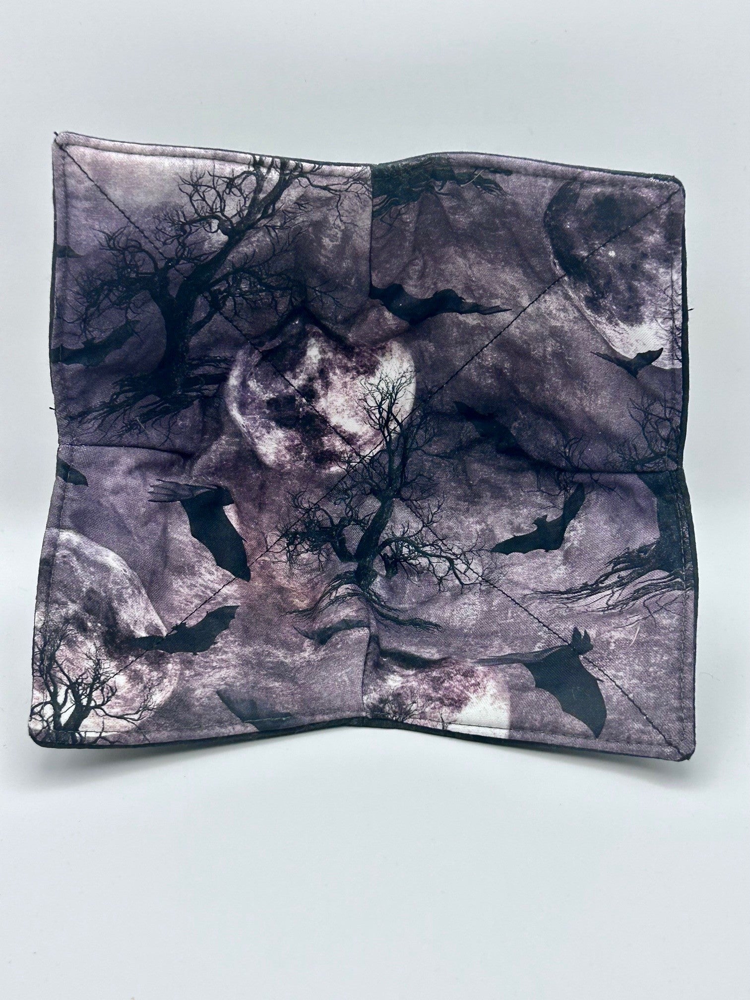 This quilted bowl cozy features a moody moonlit forest with bats and bare trees in shades of black, gray, and purple evoking the quiet magic of a haunted woodland.