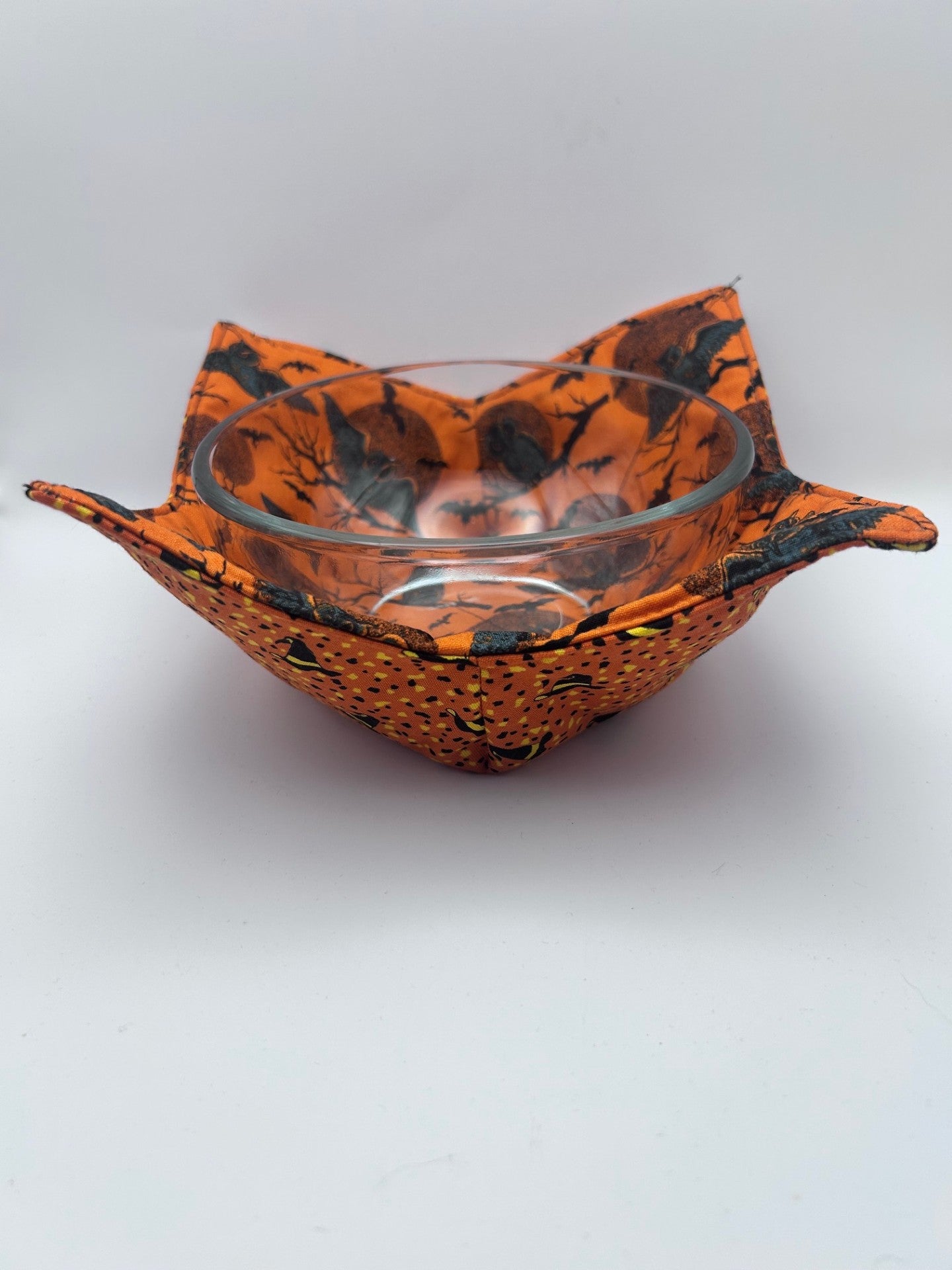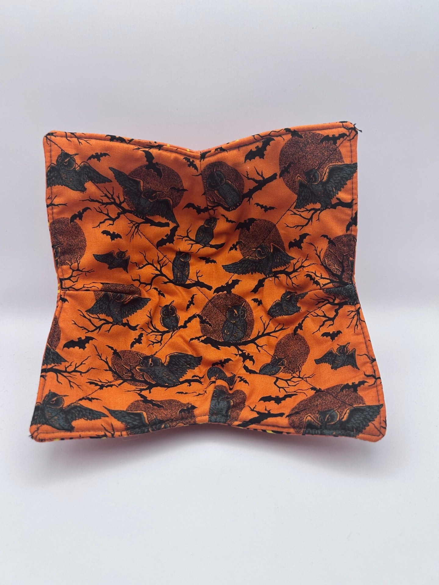 This quilted bowl cozy features a bold orange fabric with black bats, owls, and twisted tree branches perfect for adding a spooky touch to your kitchen.
