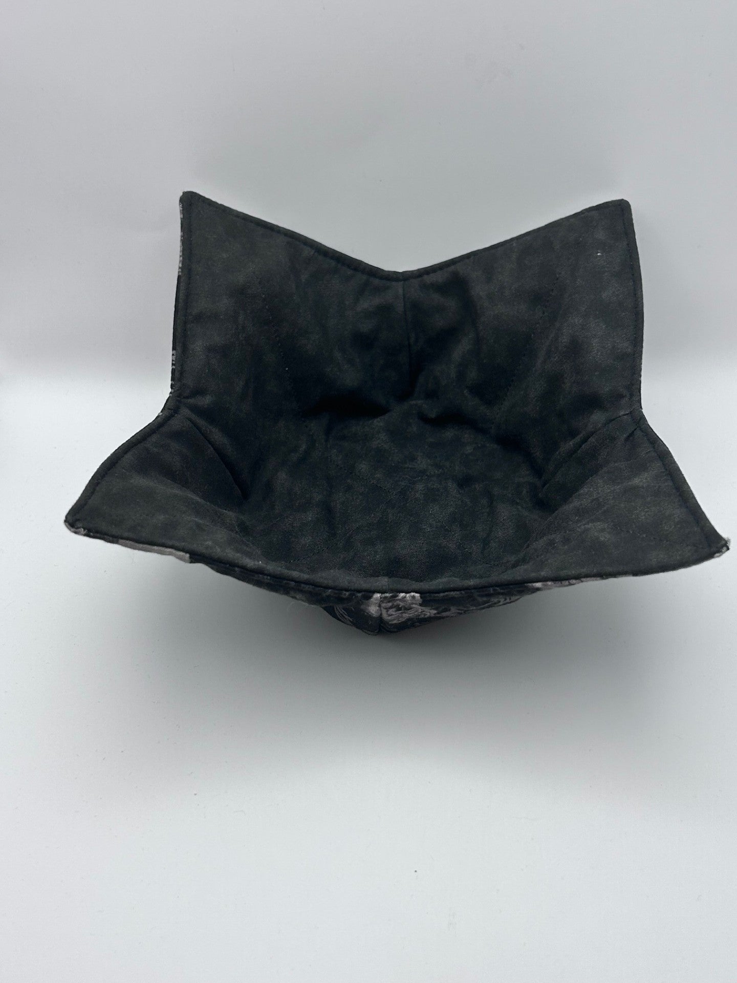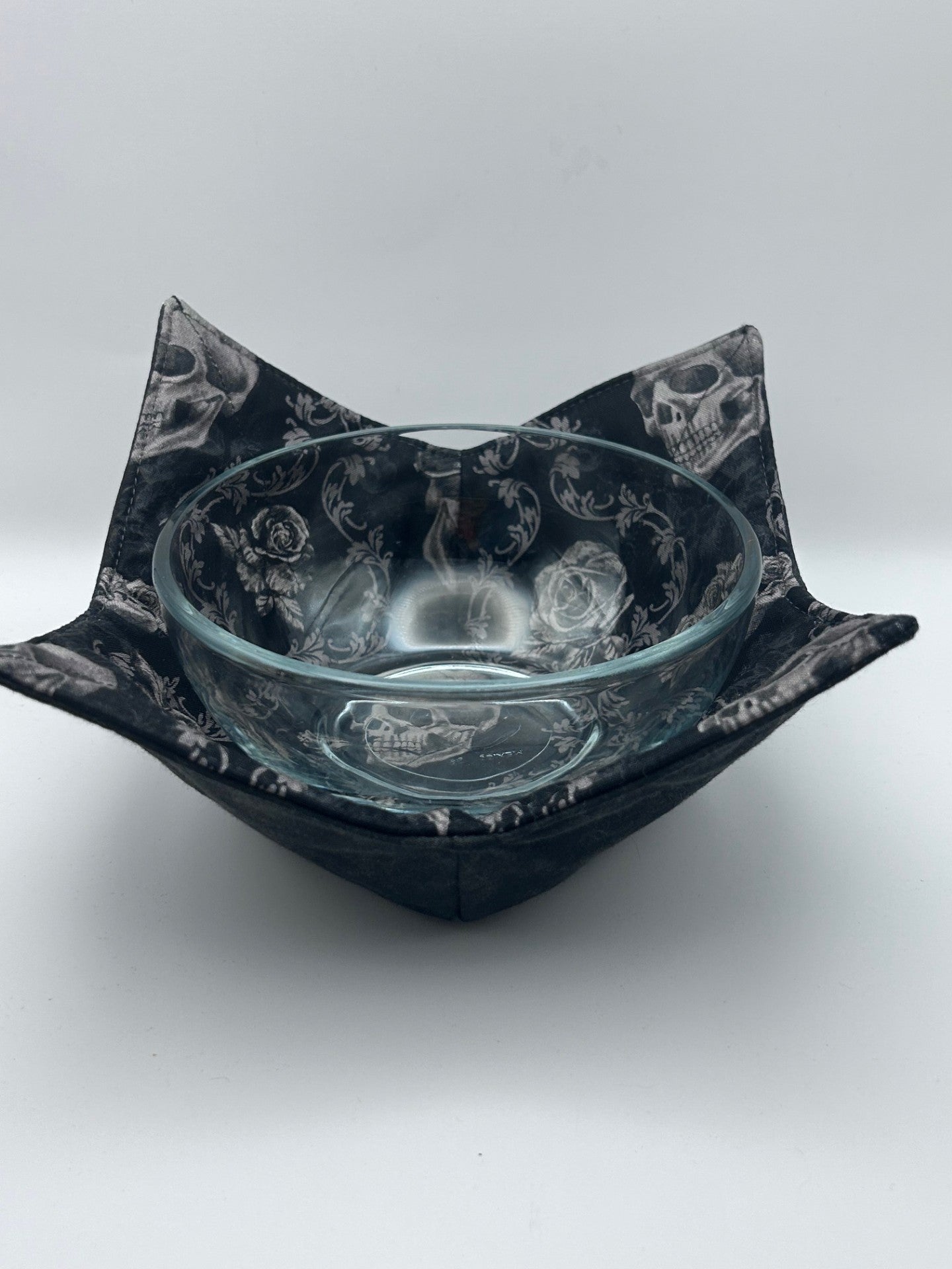This gothic quilted bowl cozy features a striking black fabric patterned with white skulls and roses, blending dark elegance with everyday function. Its padded design protects your hands from hot bowls while adding a bold, macabre touch to your kitchen. Perfect for spooky season or year-round lovers of the beautifully eerie.