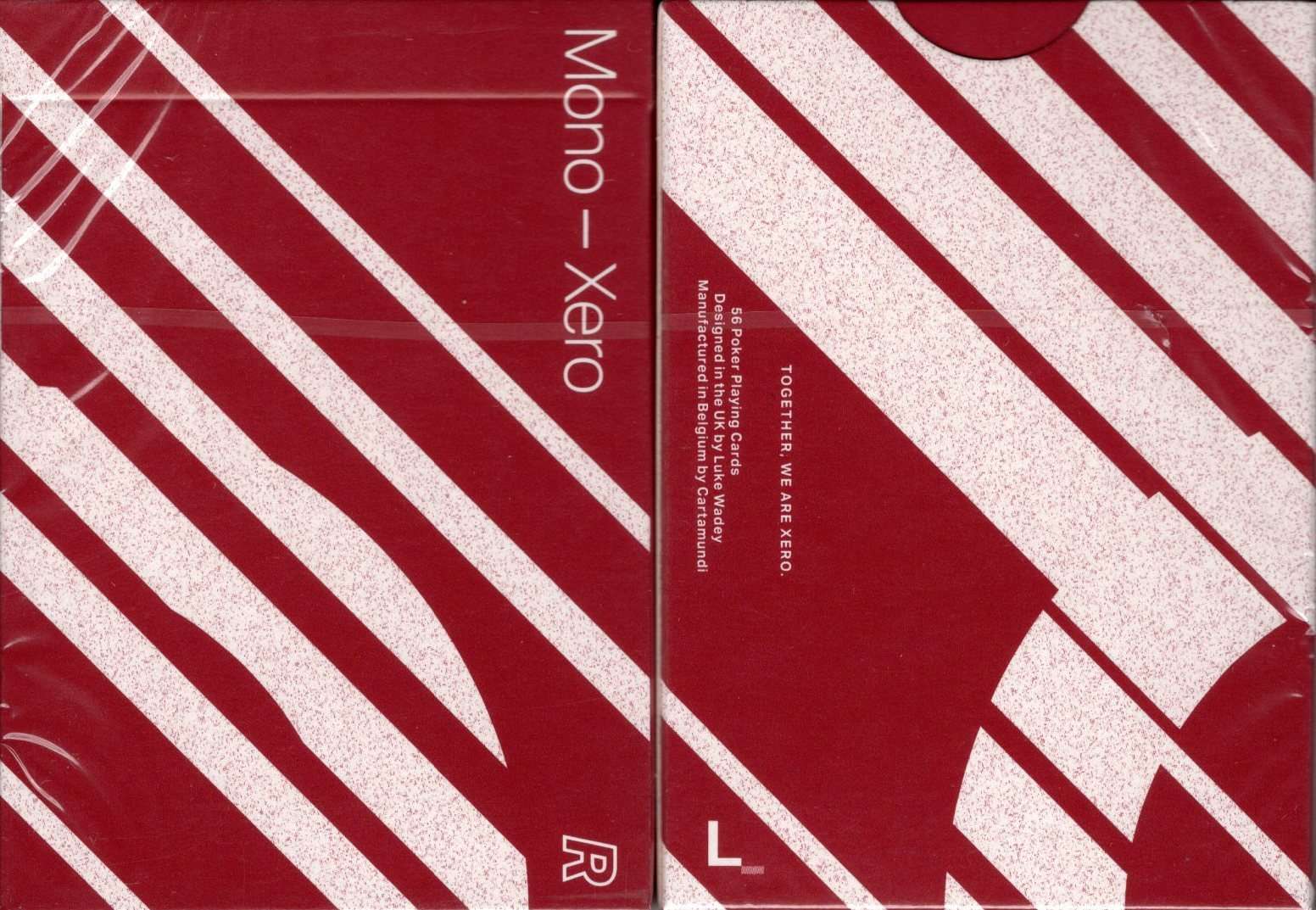 Mono - Xero picks up from distinctive theme set by Mono - X, using a bold 2-way back design combined with side details on the card faces to allow for cardists to flourish and magicians to excel in their routines. The deck uses a variety of line thicknesses with negative space and gradients to maintain the recognisable theme is carried through from the distinctive card back where a 'O' is created, all the way through the custom pips and court cards. The deck uses a vibrant red theme throughout, still with clear distinction between the suits.
