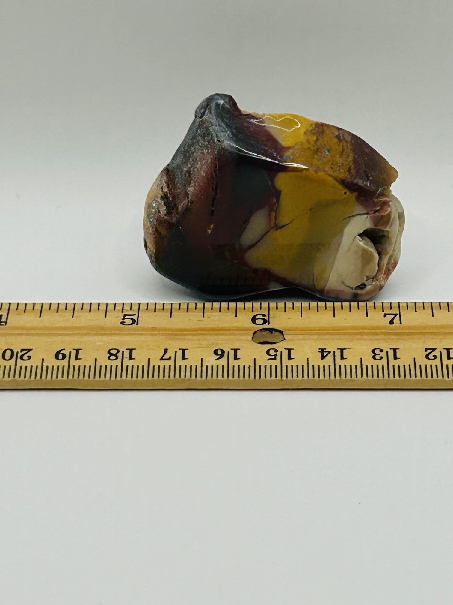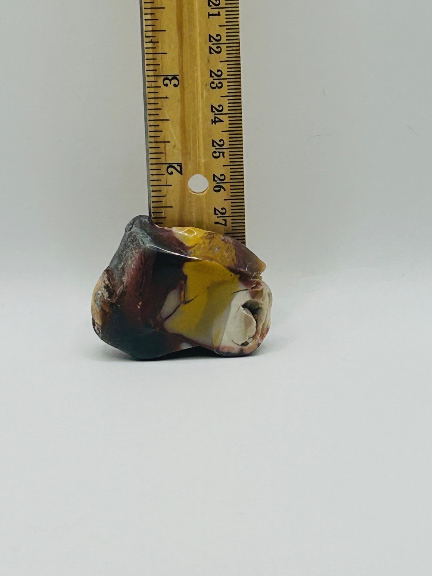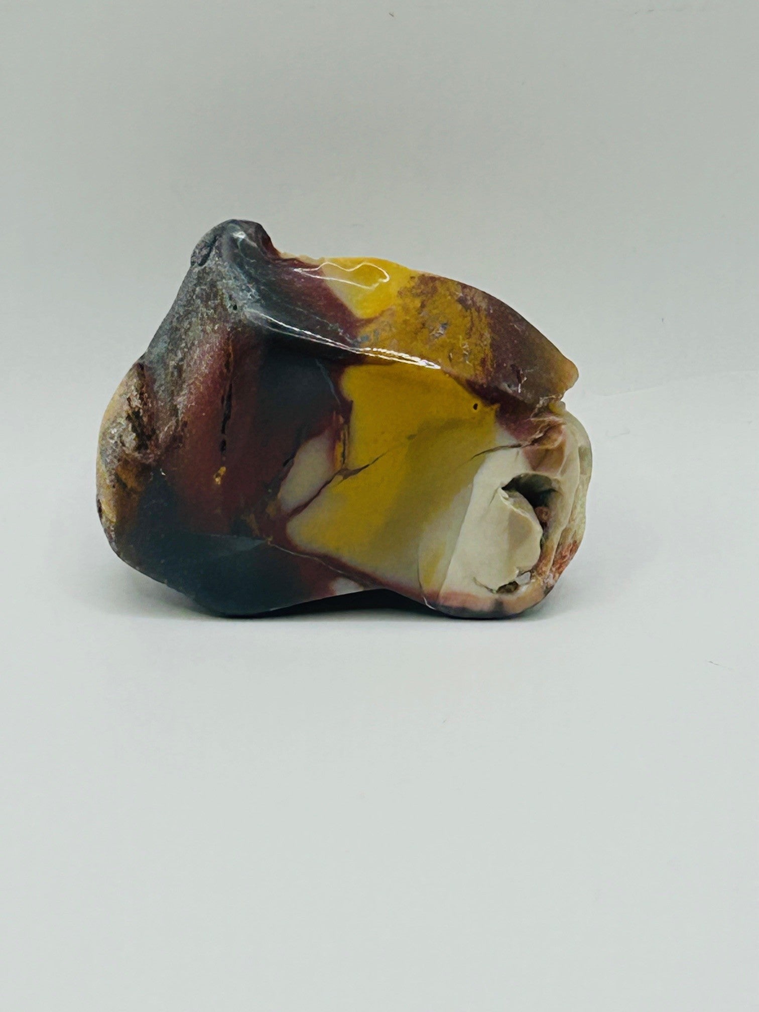 Mookaite is the wild heart of the Australian desert, a stone shaped by ancient seas and the slow dance of time. This polished piece glows with deep red, golden yellow, and creamy white—colors born from the fossilized remains of microscopic marine life. Each swirl and patch tells a story of sediment and silica, of water carving memory into stone.
