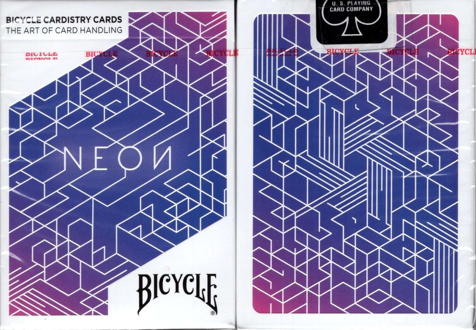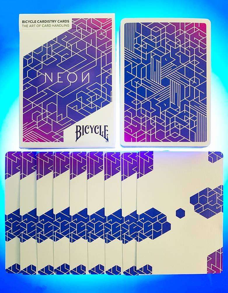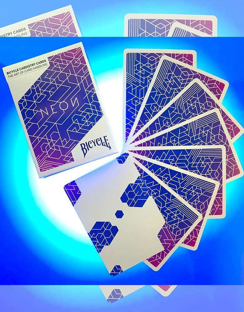 The Bicycle® Neon Blue Aurora deck has been specially designed to for the best cardistry performances. The alluring blue/violet colors will enhance any flourish and fan, while spreads will delight your audience with a soothing display of card back satisfaction.