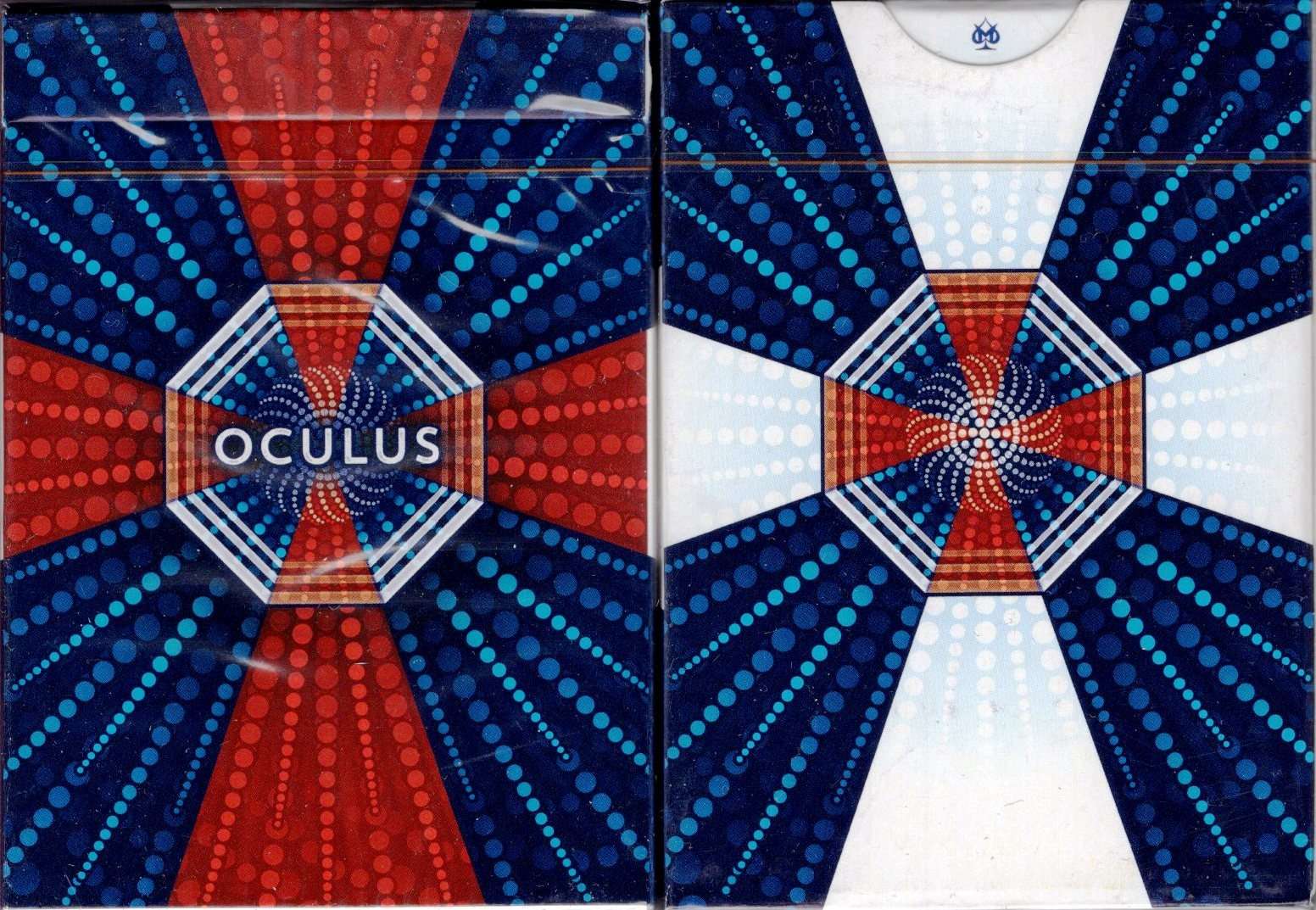 Inspired by Pointillism, the OCULUS Reduxe Deck features a four corners-bleed borderless design, with bold and vibrant blues that contrast sharply against the stark white elements that carry out to the edges. The design is meant to flow through flourishes and allow for unique displays that aren't possible with conventional borders, and to provide dynamic table displays. The OCULUS Reduxe is produced by Mike Wilson (theDoc318) and designed by Randy Butterfield (Midnight Cards).