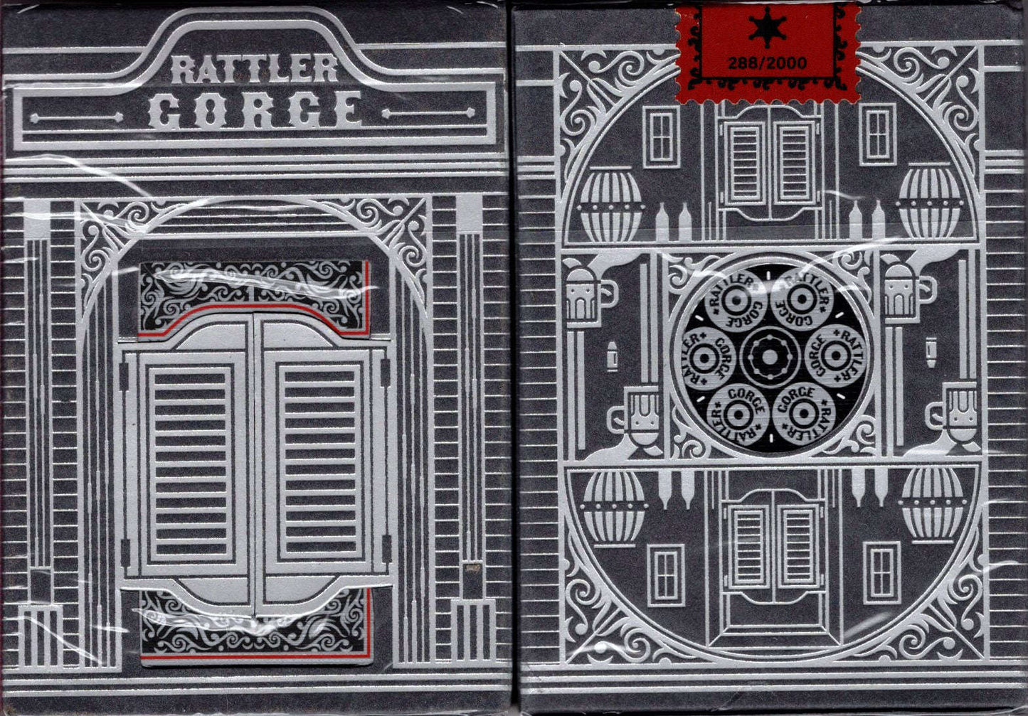 The Noir version features black and white tones that pay homage to the silver screen movies that turned the stories of the old west into legend. With a black tuck case highlighted by silver foil, this version represents a striking contrast. And of course, it includes the distinctive cutouts of its sister deck, allowing you to peek in on design elements of the cards within. The entire tuck is meant to be an experience to enjoy, capturing the feel of the buildings of the old west and giving you a truly unique way to enjoy your deck!