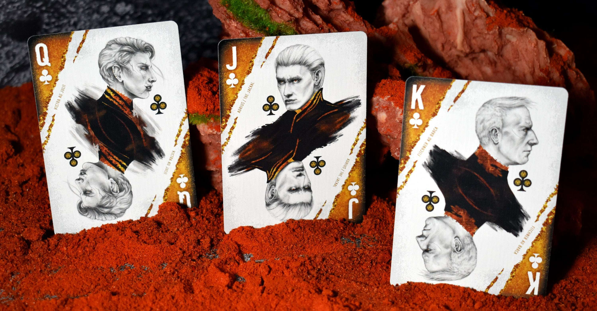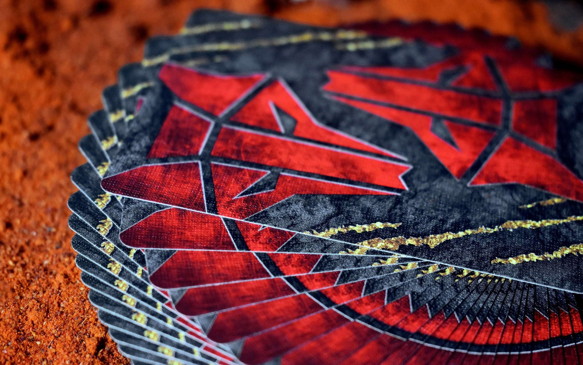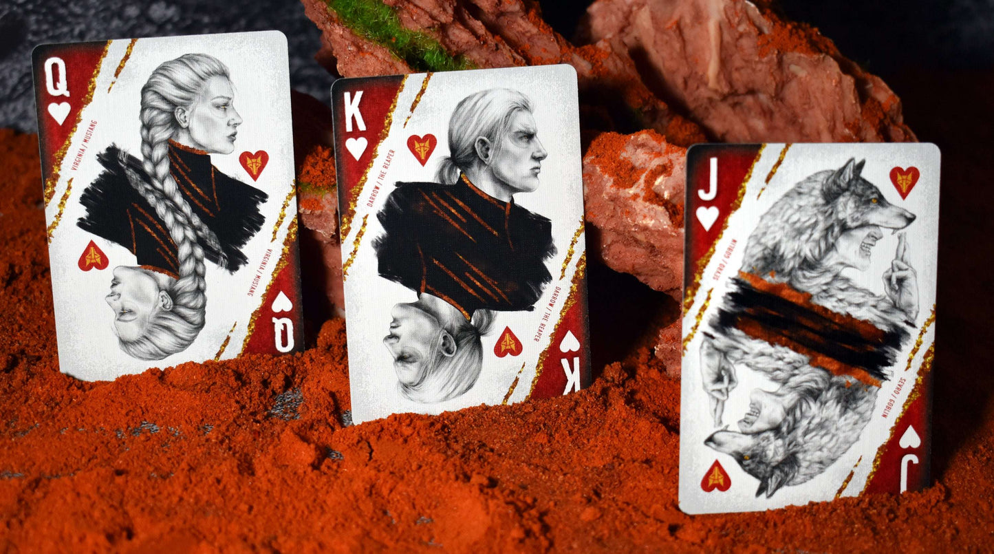 The House Mars Deck is an officially-licensed design, based on the Red Rising books by Pierce Brown. The fully-custom design features beautiful character illustrations by Briana Crotinger and design by Randy Butterfield. It’s printed by Legends Playing Card Co. and utilizes their exceptional Classic Finish.The Courts and Jokers are highlighted with Briana’s illustrations of Pierce Brown’s characters. The Back Card for the House Mars Deck prominently features the House Mars sigil. The PIPS each feature some of the Red Rising iconography. House Mars for the Hearts, Gold Sigil for the Spades, Red Sigil for the Diamonds and The Society for the Clubs.The Tuck Box for the House Mars Deck also features the House Mars sigil. It has rough texture imagery within the wolf head and is set off nicely with the contrast of the black rock texture background. Scattered throughout the Tuck Box and Back Card are elements of gold leaf designs. They symbolize an Iron Rain. The House Mars Deck will take your game night to the next level!