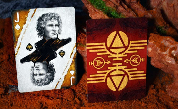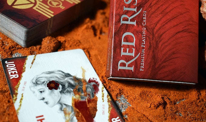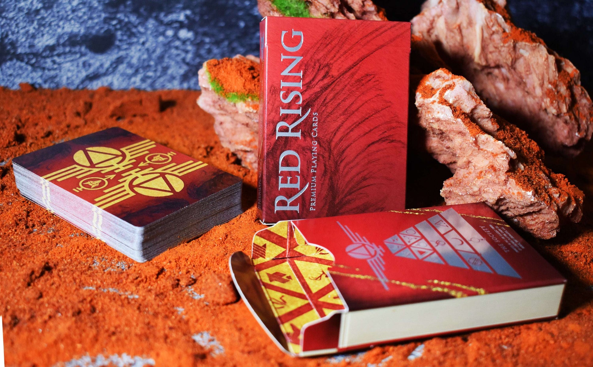 The Red Rising Deck is an officially-licensed design, based on the Red Rising books by Pierce Brown. The fully-custom design features beautiful character illustrations by Briana Crotinger and design by Randy Butterfield. It’s printed by Legends Playing Card Co. and utilizes their exceptional Classic Finish.The Courts and Jokers are highlighted with Briana’s illustrations of Pierce Brown’s characters. The Back Card for the Red Rising Deck features the black wings from the Tuck Box, and also utilizes a combination of the Gold, Red and House Mars sigils. The PIPS each feature some of the Red Rising iconography. House Mars for the Hearts, Gold Sigil for the Spades, Red Sigil for the Diamonds and The Society for the Clubs.The Tuck Box for the Red Rising Deck is an inverse of the original Red Rising book cover. Black wings are featured over the red textured background. The top, right and bottom panels are designed to look like the edges of a book. The left panel is the book’s spine. When assembled together, the Red Rising Tuck Box resembles a mini version of a book. The Red Rising Deck will take your game night to the next level!