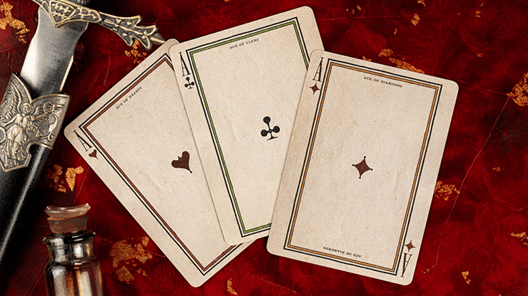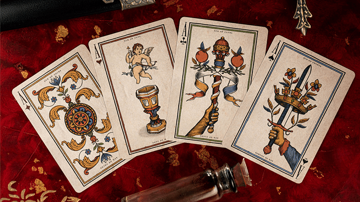 A luxurious deck of playing cards made with high-quality materials featuring a classic intricate design that is both elegant and timeless. The classic Shakespearean Romeo & Juliet comes to life in a new way through this beautiful deck of luxury playing cards. The Romeo & Juliet deck of playing cards features hand-inked two-way court cards, classic pips and a two-way seal back design.