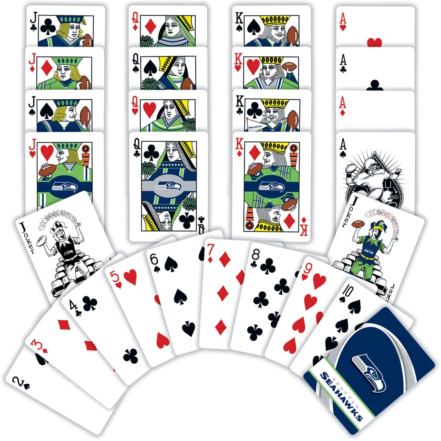 The 12s have always given the Seahawks an unfair advantage at Lumen Field. Now you can celebrate your team at home or while tailgating with these officially licensed playing cards. Each standard deck contains 52 high quality cardstock playing cards and 2 jokers. Card-back designs feature your Seahawks logo. All face cards and jokers have detailed, custom designs.