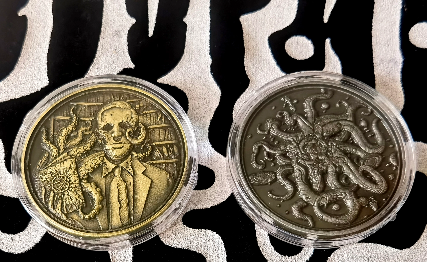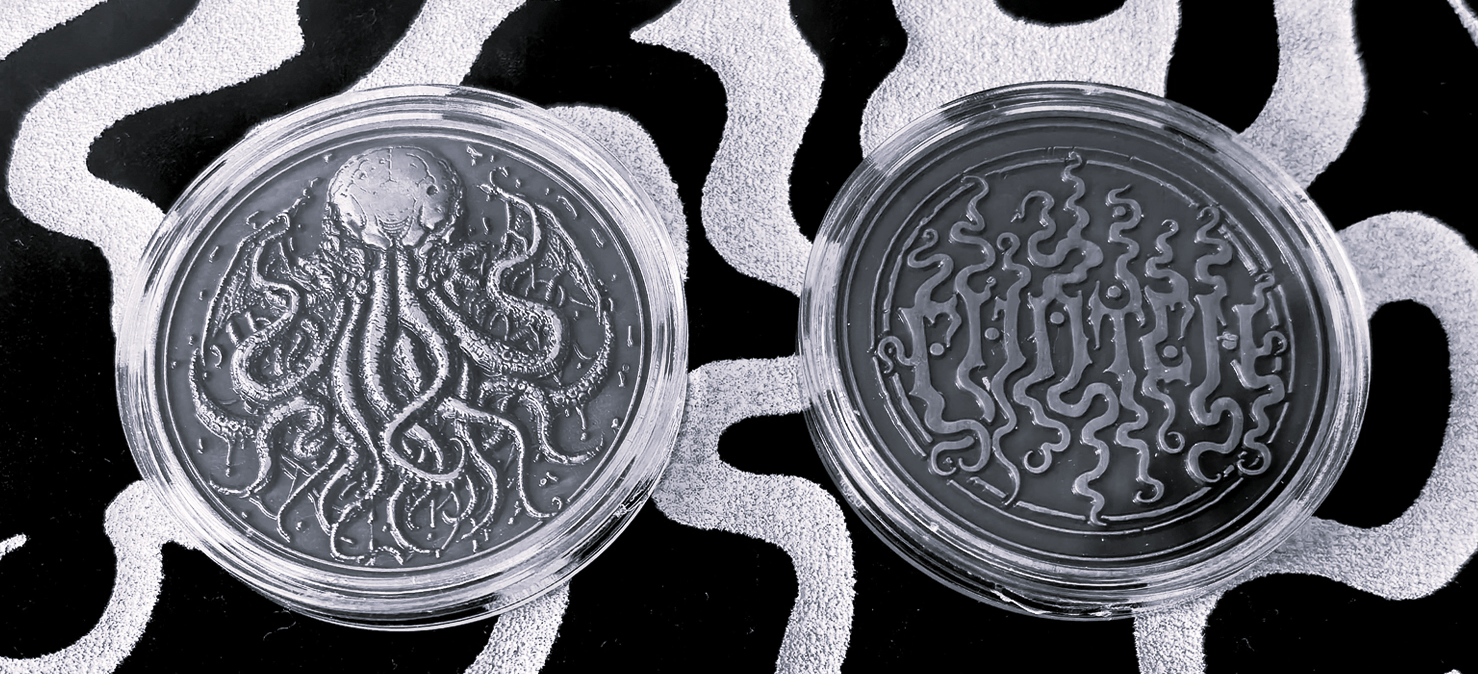 Make your fate a flip away with this pair that bring eldritch horror to every toss. One coin features a portrait of H. P. Lovecraft, surrounded by tomes and tentacles. The other coin features the menacing visage of Cthulhu, rising with hypnotic tendrils from the depths.