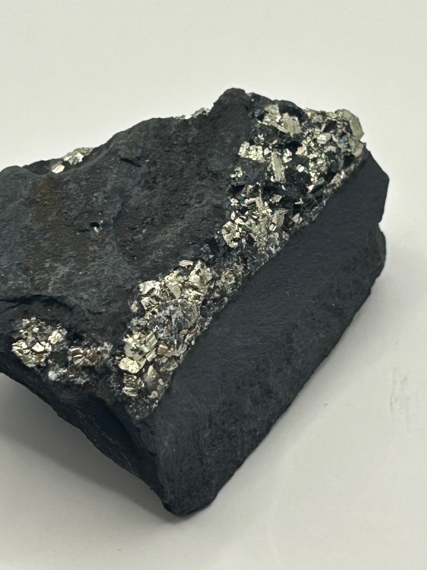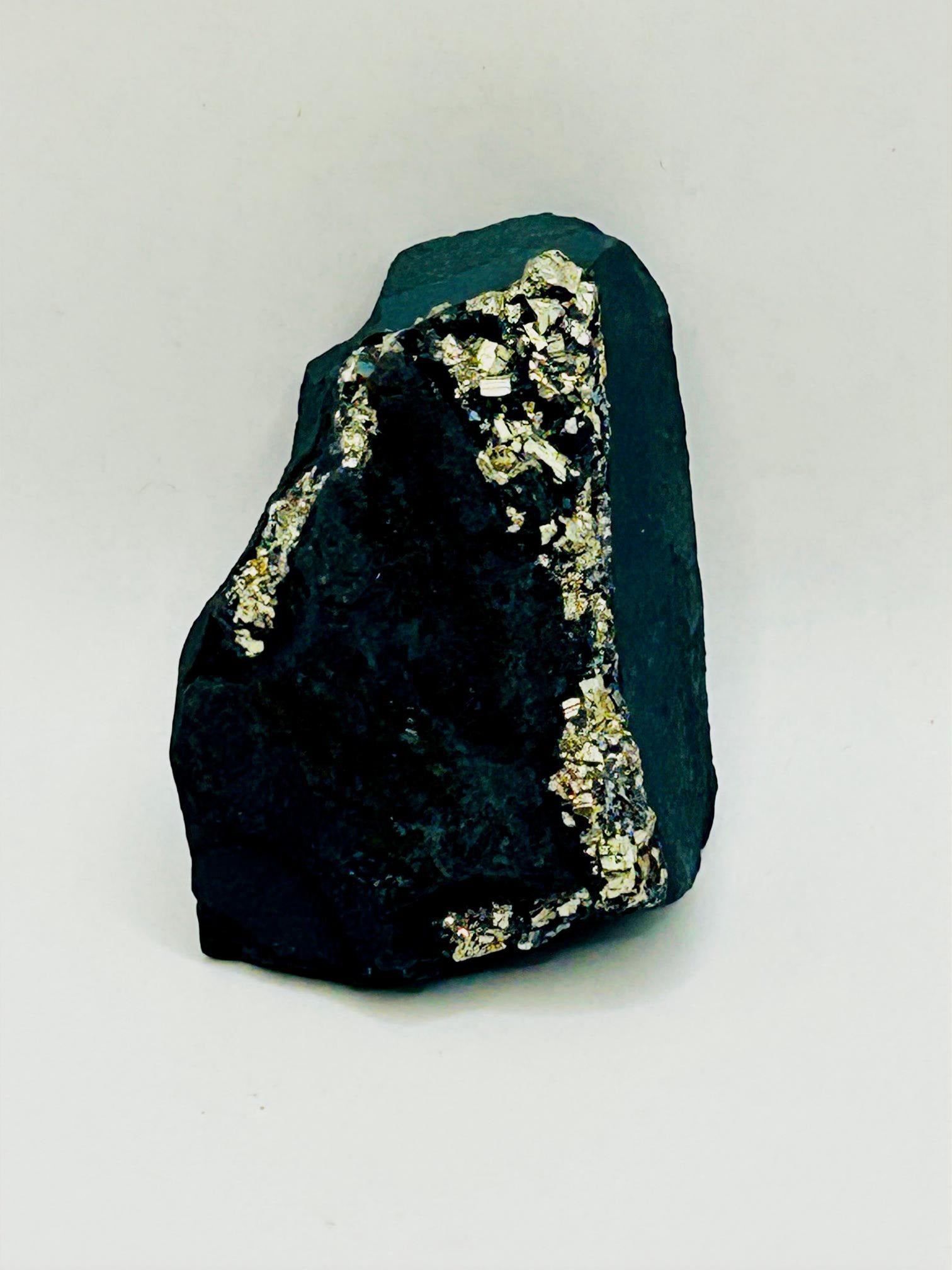Shungite with Pyrite is a striking mineral combination where golden pyrite crystals form against the deep black of shungite. Shungite is valued for its grounding and protective qualities, often used to absorb negative energy and shield against electromagnetic frequencies. Pyrite brings vitality, confidence, and abundance, resonating with the solar plexus chakra. Together they create a powerful balance of purification and empowerment, making this pairing ideal for meditation, manifestation, and energetic protection.