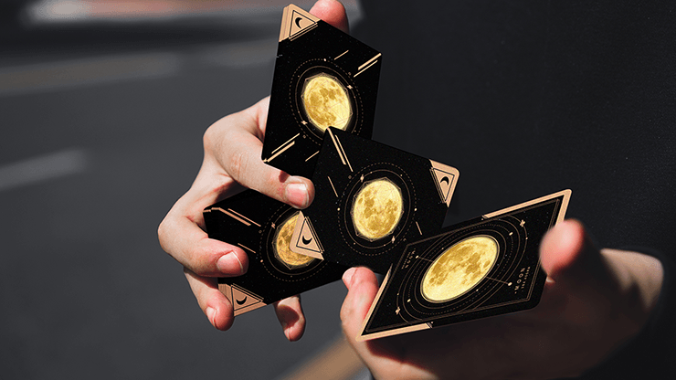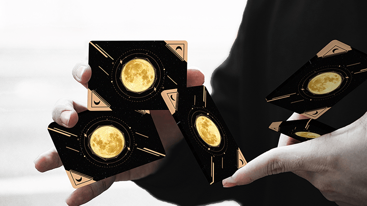 The Moon Playing Cards is inspired by the moon, which is the closest planet to the Earth. We used a lot of light gold to restore the beauty of the moonlight at night. And the main feature of the design is that its face cards have no suits and numbers, the artwork has been designed in a way to improve the effect of cardistry in action.