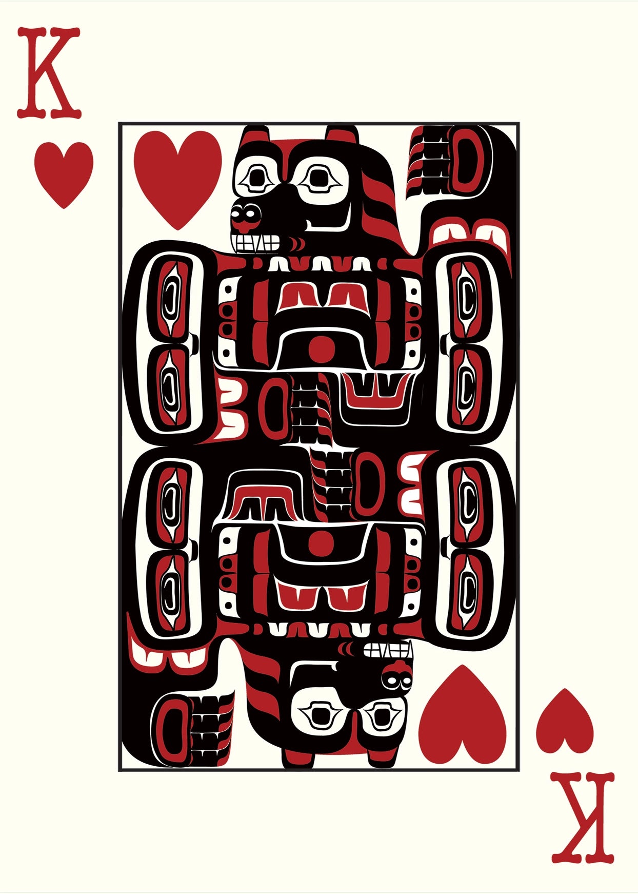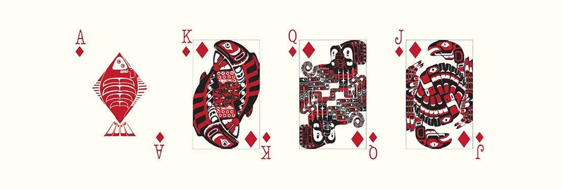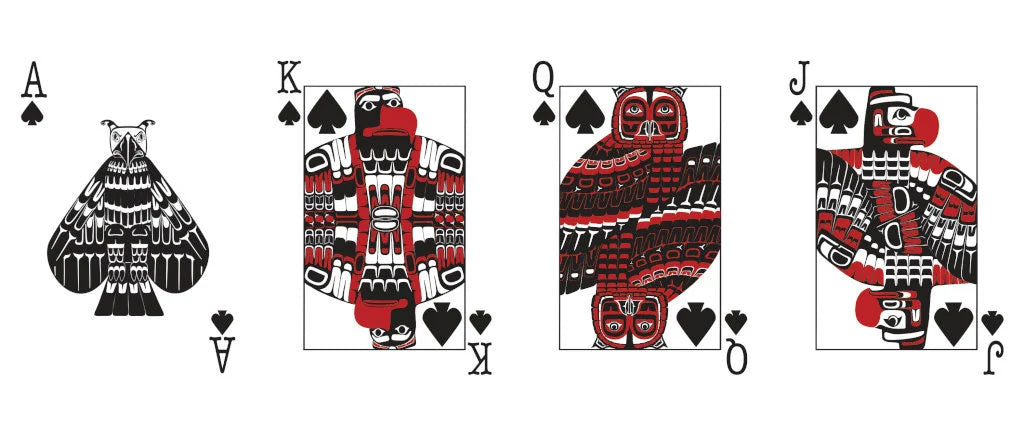These cards are of the highest quality. Each card is unique, with face cards designed according to the totem hierarchy of the Northwest. They resemble classic playing cards, making them easy to recognize and play with. There are 52 unique designs and 2 unique jokers